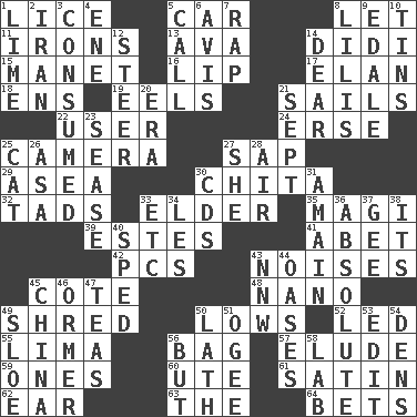 ACROSS 1. Louse (plural) 5. 4-wheeled motor vehicle 8. Allow 11. Removes the wrinkles 13. Actress Gardner 14. "You Light Up My Life" star Conn 15. French painter Edouard 16. Mouth edge 17. Enthusiasm 18. Followers of ems 19. Snakelike fish 21. Moves on water 22. One who makes use of a thing 24. Celtic language 25. Device for capturing images 27. Plant excrement 29. At sea 30. Riviera of "Kiss of the Spider Woman" 32. Small amounts or degrees 33. A person who is older than you are 35. Wise men 39. _____ Park, CO 41. Collude with 42. Personal Computers (abbr.) 43. Annoying sounds 45. ____ d'Azur (French Riviera) 48. Billionth: prefix 49. Tear up 50. Moos 52. Directed 55. Pale green bean 56. Paper or plastic container 57. Dodge 59. Washington bills 60. Shoshoni 61. Smooth fabric 62. Hearing organ 63. Definite Article 64. Antes DOWN 1. Citrus frut 2. SW Asia republic 3. Eaten 4. Compass dir. 5. Give a ring to 6. Opinion 7. Strike 8. Ms. Damita and namesakes 9. Peak District village in England 10. Metal containers 12. Navigate 14. Letter starter 20. Epoch 21. Back-to-school mo. 23. Gospel singer Marvin 25. Feline 26. White ___ sheet 27. A female animal or person 28. Atmosphere 30. Music discs 31. With great haste 33. And so on (abbr.) 34. French article 36. Utter; complete 37. Turn to the right 38. It is 40. Hurried 43. Compass dir. 44. Fertile tracts in a desert 45. Large country 46. Channel Islands abalone 47. Beverages made from leaves 49. A type of plum 50. Thin strip of wood or metal 51. Double curve, resembling the letter S 53. Prepare for publication 54. Lairs 56. On the contrary 58. Experiment locale