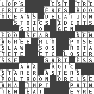 ACROSS 1. Chops off 5. Eastern Standard Time (abbr.) 8. Three (prefix) 11. 4th largest of the Great Lakes 12. Supplements with great effort 13. Friend of Pooh 14. Seas 17. Accusation by an informer 19. Unemotional ones 21. Foolish or stupid persons 22. Grain storage tower 23. Commissioned military rank (abbr.) 24. Egg _ yung 27. Wither 29. ___ Haven, CT 32. Match 34. _ de Janeiro 36. Introduce or present, as a question 37. Cole _ (cabbage dish) 38. Mayday 39. Round or rotation of duties 40. Wig 41. And so on (abbr.) 42. Failure 43. Compass dir. 44. Indian skirt 46. Curvy letter 47. American Automobile Association (abbr.) 50. College mil. group 52. A viewer who gazes fixedly 55. Michaelmas daisies 57. Characterized by complete cowardliness 59. Threatening words 62. Wet nurse (var.) 63. Body of Kaffir warriors 64. Ache 65. Nine, plus one 66. Consume 67. Jane of fiction DOWN 1. Lion 2. The grampus (Milton) 3. Sliced desserts 4. Theater features 5. Make supply last 6. Major League Baseball Commissioner Bud 7. Sadhe (variant) 8. Musical group of three 9. Carrot, for example 10. Charged particles 12. Begley and Asner 15. Annoying sound 16. Drop; flow; fall 18. Shallow baking pan 20. Unrefined 24. Goes without food and/or water 25. Stares 26. Speak pompously 28. Disturbances 29. Trap for birds or small mammals 30. _____ Park, CO 31. Puts on (as clothing) 33. She-sheep 35. Motion picture awards 36. Adept person 42. 61 cubic inches 45. Printing process, for short 47. Tate display 48. Nest on high 49. Odor 51. Streamer paper 52. Petty quarrel 53. Heavy book 54. Actor Alda or Thicke 55. Cuckoo 56. Kill 58. Elect 60. Title for a knight 61. Compass dir.