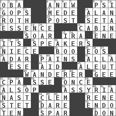 ACROSS 1. Chief or king in Benin or Nigeria 4. Afresh 8. 23rd letter of the Greek alphabet 11. Republicans 13. Ancient Persian 14. Actor Alda or Thicke 15. Writer of Portnoy's Complaint (1969) 16. Mail 17. Bristle 18. Substance 21. Apartment or room in a ship 22. Fly high 23. Retirement account (abbr.) 25. Compass dir. 26. It is 29. Orators 32. Sibling's daughter 34. Sometimes accompanies a hiss 35. Greek goddess of the dawn 38. The sixth month of the Jewish calendar 39. Aches 41. Silent film actress Nazimova 43. Compass dir. 44. Assist 45. Native American of Southwest Alaska 46. Nomad 50. Unit of force equal to gravity 51. Accounting whiz (abbr.) 54. Compass dir. 55. Single time 57. Columnist Joseph or Stewart 59. Nineveh was its capital 63. Political cartoonist Thomas 64. Clement's nick name 67. French philosopher Descartes 68. Proofreading order 69. Have the gumption 70. Inside; within (prefix) 71. "___ Little Indians" 72. Coast Guard woman 73. Spanish title DOWN 1. Legendary monster 2. Scornful sounds 3. Flats, for short 4. Electrical Unit 5. Modern: prefix 6. Begley and Asner 7. Soggy 8. First-year military academy student 9. Smooth fabric 10. Silly 12. "______ My Girl" (Turtles hit) 14. White ___ sheet 19. Characteristic smell of wine 20. Head covering 21. Automobile 23. Image 24. Vintage cars 26. _ tizzy (2 wds.) 27. Event that recurs at intervals 28. Oceans 30. Tolerate 31. Lick closed 33. Ship's personnel 36. Cassini of fashion 37. Turn sharply 39. Baking dishes 40. Helper 42. Had dinner 45. Arches 47. Viper 48. Nomad 49. Followers of ems 51. 2nd pers. sing. pres. of can (arch.) 52. Food holder 53. NE Netherlands city 56. Jane of fiction 58. Baseball player Mel 60. Tear apart 61. _ china 62. A really long time 64. Music discs 65. Infant locale 66. Period