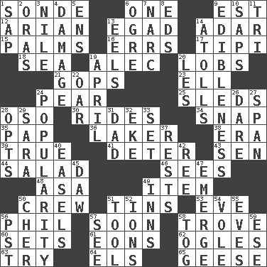 ACROSS 1. Message 6. Single 9. Eastern Standard Time (abbr.) 12. Believer in; advocate of (suffix) 13. Mild oath 14. The sixth month of the Jewish calendar 15. Insides of hands 16. Blunders 17. Native american tent (variation) 18. Ocean 19. Actor Baldwin 20. Tennis shots 21. Republicans 23. Pipe bend 24. Lightbulb-shaped fruit 25. Bobsleighs 28. Bear (Spanish) 30. Amusement-park features 34. Fastener 35. Infant food 36. Member of a famous L.A. basketball team 38. Period 39. Loyal 41. Prevent from occurring 43. Elected rep. 44. First course 46. Perceives with the eye 48. White ___ sheet 49. A distinct part 50. Group working together 51. Metal containers 53. First lady 56. Silvers or Donahue 57. Within a short period 58. Collection of objects 60. Arranges properly for use 61. Immeasurably long periods of time 62. Stares at amorously 63. Attempt to accomplish something 64. Raised railways 65. Honkers DOWN 1. Plant excrement 2. Mouths or openings 3. The longest river in the world 4. Break 5. Followers of ems 6. Legendary monster 7. Drug cop 8. Begley and Asner 9. The property of being fit to eat 10. Plant excrements 11. Three (prefix) 13. Snakelike fish 14. Ringlike coral islands and reefs 19. Showery time 20. French article 22. Boat paddle 24. Teen's desire 26. Have the gumption 27. Connect, as a bridge 28. Elects 29. "Two Mules for Sister ____" 31. Male parent 32. Supplement with great effort 33. Put into a specified state 37. Musical pauses 40. Artist's stands 42. Portuguese money of account (variant) 45. Fool 47. Develop 49. Restaurants 50. "Mermaids" star 51. Implement 52. Charged atoms 54. Short-tailed, large-bodied rat 55. Nights before holidays 56. Pacific Standard Time (abbr.) 57. Observe 58. Coat; cloak 59. Compass dir.