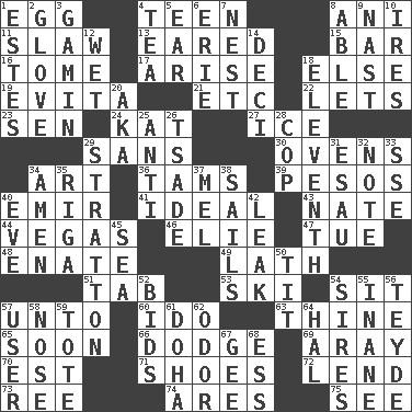 ACROSS 1. Ovum 4. Adolescent 8. Black tropical American cuckoo 11. Cole _ (cabbage dish) 13. Having ears or earlike features 15. Tavern 16. Heavy book 17. Get up 18. Otherwise 19. Webber/Rice musical 21. And so on (abbr.) 22. Allows 23. Elected rep. 24. Krazy ___ of comics 27. Frozen water 29. Without 30. Baking chambers 34. Nonscientific branch of learning 36. Scottish caps 39. Mexican monetary units 40. Independent ruler or chieftain 41. Perfect 43. Nathan's nickname 44. Viva Las _ 46. Writer Wiesel 47. Third day of the wk. 48. Related on the mother's side 49. Thin strip of wood or metal 51. Bar bill 53. What Jean-Claude Killy likes to do 54. Be seated 57. To (old English) 60. Wedding promise 63. One or ones belonging to thee 65. Within a short period 66. Evade 69. Like ___ of sunshine 70. Eastern Standard Time (abbr.) 71. Imelda's hoard 72. Grant temporary use of 73. To sift 74. Ancient Greek god of war 75. Observe DOWN 1. _____ Park, CO 2. Michael Jackson trademark 3. Homeless child 4. Beverage made from leaves 5. Ewer handle 6. 4th largest of the Great Lakes 7. A home for chicks 8. Competent 9. Political cartoonist Thomas 10. Angers 12. Soggy 14. Tenth: prefix 18. Veterans Day date 20. Alias (abbr.) 25. Opposed to 26. Sadhe (variant) 28. Police officer (slang) 29. Ski resort town in Vermont 31. He sold his birthright 32. Short letter 33. Compass dir. 34. So be it 35. Capital of Latvia 37. Cartoonist voice _ Blanc 38. Travels by water 40. First lady 42. Path through which fluid escapes 45. Ocean 50. Teat (slang) 52. Auction offers 54. Male parents of animals 55. Empty; void 56. Miss Universe 1986, Barbara Palacios _ 57. One who makes use of a thing 58. Sense of smell 59. Haul 61. Capital of the state of Qatar 62. Aroma 64. Actor Linden 67. Turn to the right 68. Curvy letter