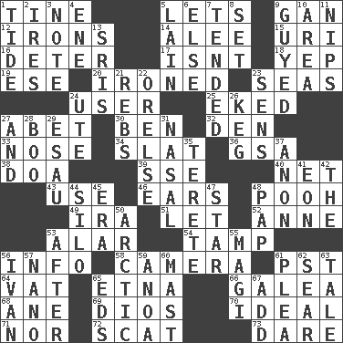 ACROSS 1. Prong on a fork 5. Allows 9. Separate the seeds from cotton 12. Metal shackles 14. Toward shelter 15. RI univ. 16. Prevent from occurring 17. Is not 18. Slangy assent 19. Compass dir. 20. Pressed 23. Oceans 24. One who uses or employs something 25. Made supply last 27. Collude with 30. Benjamin's nick name 32. Lair 33. Sense of smell 34. Narrow board 36. Girls' org. (abbr.) 38. ___ good deed 39. Compass dir. 40. Remaining after all deductions 43. Purpose 46. Hearing organs 48. "Silly old bear" 49. Lyricist Gershwin 51. Allow 52. Singer Murray 53. Having or resembling wings 54. Pack (down) 56. Information 58. Device for capturing images 61. Pacific Standard Time (abbr.) 64. Large container 65. Inactive volcano in Sicily 66. An organ shaped like a helmet 68. One (Scot) 69. "Vaya con ____" 70. Perfect 71. Not either 72. Scram! 73. Have the gumption DOWN 1. Event that recurs at intervals 2. Angers 3. Make mention of 4. Compass dir. 5. (Had) reclined 6. Otherwise 7. Looked after 8. Put into a specified state 9. Secured 10. Length times width 11. Pinches, bites 13. Indian titles of respect 21. Confederate soldiers (slang) 22. Threatening words 23. Elected reps. 24. Shoshoni 26. Barrel 27. Plus 28. Sometimes accompanies a hiss 29. Son of Isaac 31. Rhinal 35. Cylindrical with tapered ends 37. At once, immediately (arch.) 41. Period of immesurable duration 42. Definite Article 44. Grain storage tower 45. Epoch 47. Play the lead 48. Infant food 50. Northern region 53. Following 55. Wise men 56. "Terrible" tsar 57. Billionth: prefix 59. Small Philippine buffalo 60. Vertical spar for supporting sails 61. Entreaty 62. Shrivel 63. Lie 65. Begley and Asner 67. Find the sum of