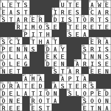 ACROSS 1. Allows 5. Shoshoni 8. Deep reverence 11. 90 degrees 12. Angers 13. 4-wheeled motor vehicle 14. A viewer who gazes fixedly 17. What propaganda does 19. Full of chinks, cracks, or crevices 21. Cylindrical with tapered ends 22. Heart or essence 23. Ocean 24. _-fi 27. Not this but _ 29. Period 32. Actor Sean's family 34. 24 hours 36. Indian titles of respect 37. Rounded earthenware pot or jar 38. Supplement with great effort 39. Taverns 40. Cassini of fashion 41. Lair 42. Originate 43. Remaining after all deductions 44. Play the lead 46. Car or cant ending 47. Housemaid (var.) 50. Capital of Western Samoa 52. Spoke pompously 55. Michaelmas daisies 57. Conveyance 59. Had an oblique or slanted direction 62. Single 63. Roll call or roster of names 64. Within a short period 65. Portuguese money of account (variant) 66. Eastern Standard Time (abbr.) 67. Inactive volcano in Sicily DOWN 1. French article 2. Ingest 3. Russian ruler of old 4. Long narrow piece of something 5. RI univ. 6. Trials 7. First name in cosmetics 8. Land measure 9. Electrical Unit 10. Celtic language 12. Binary compound 15. Sends forth 16. Writer of Portnoy's Complaint (1969) 18. Mouth or opening 20. Cast a shadow over 24. Soup utensil 25. Cell (Danish) 26. An arm off of a larger body of water 28. Receives possession of 29. Bert's buddy 30. Wash lightly 31. NE Netherlands city 33. Tired old horse 35. Gossips 36. Title for a knight 42. Satellite of Uranus 45. Tenement units (abbr.) 47. "One Day ___ Time" 48. Distance measurement (Brit.) 49. Goodbye (Sp.) 51. Came up 52. Aroma 53. French philosopher Descartes 54. Toward shelter 55. Santa ___, CA 56. Specific locale 58. Baseball player Mel 60. A really long time 61. Heredity factor (abbr.)
