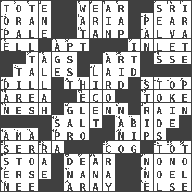 ACROSS 1. Lug 5. Erode 9. _ Lanka 12. NW Algerian seaport 13. Operatic vocal solo 14. Lightbulb-shaped fruit 15. Light colored 16. Pack (down) 17. Inventor's middle name 18. Pipe bend 19. Fitting 21. An arm off of a larger body of water 22. Labels 24. Tate display 26. Compass dir. 27. Falsehoods 28. Put down 29. Deli pickle 30. One of three equal parts 32. Close up, plug up 36. Type of rug 37. Environmental prefix 38. Puff or smoke 39. Tender 40. American astronaut and politician John 42. Precipitation 43. Table seasoning 44. Tolerate 46. Nanny (var.) 49. Adept person 50. Pinches, bites 51. Spanish missionary in California 53. Gear tooth 54. Small child 57. Portico 58. Letter starter 61. Words to Nanette 62. Celtic language 63. Grandmother 64. Christmas carol 65. Born 66. Like ___ of sunshine 67. Otherwise DOWN 1. Drink excessively 2. Spoken 3. Baron Munchausen's specialties 4. Compass dir. 5. Electrical Unit 6. Epoch 7. Direct toward a target or goal 8. Reproach for some lapse or misdeed 9. Exchanges for money 10. All-night dance parties 11. Feeling or showing extreme anger 14. Baking dish 19. Grow older 20. Inconspicuous attention getter 21. It would 23. Assad's deity 24. Composer Copland 25. To free from 27. Become fatigued 28. It is permitted: Lat. 29. One of the 12 tribes of Israel 31. Phone greeting 32. Long narrow piece of something 33. Inedible or poisonous agaric 34. Migrant worker of the '30s 35. Writing instrument 40. Slender fish 41. Billionth: prefix 43. Health resort 45. Large 46. NE Netherlands city 47. Distance measurement (Brit.) 48. Came up 52. Actress Charlotte 53. Supercomputer manufacturer 55. Washington bills 56. Lacquered or enameled metalware 58. Heredity factor (abbr.) 59. Hearing organ 60. Santa ___, CA 61. Compass dir.
