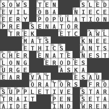 ACROSS 1. Sty mamas 5. Nine, plus one 8. Downhill vehicle 12. Tending to cause great harm 13. Chief or king in Benin or Nigeria 14. Sibling's daughter 15. Suggestive of the supernatural 16. Census information 19. Before (prefix) 20. Legislator 21. Long journey 23. And so on (abbr.) 24. Leather borer 27. Floor protectors 30. Leg joint 31. Value system 34. Pismires 35. "Mermaids" star 38. Related on the mother's side 40. A home for chicks 41. Yearn 42. Eats (away) 44. Goad 45. "____ silly question..." 46. Ewer handle 47. Large container 50. He sold his birthright 53. Speakers 57. Back 59. Supplementary 63. Play the lead 64. Distinguishing feature 65. Fenced enclosure 66. Bristle 67. Assistant 68. Indiana (abbr.) 69. Songbird DOWN 1. Ooze 2. Unconcealed 3. One who wires 4. Wily 5. Drink excessively 6. Inky black, to poets 7. California wine valley 8. Be seated 9. Luau accessory 10. Environmental prefix 11. Lair 14. Drug cop 17. Shoshoni 18. Car dealer's back yard 20. Three-handed card game 22. Develop 24. Queen of England 1702-14 25. Moistens 26. For fear that 28. Definite Article 29. Trig term 30. Sunflower state 32. 4-wheeled motor vehicle 33. Portico 35. A slight indication 36. Israeli folk dance 37. Engineer (abbr.) 39. Begley and Asner 43. Supplements with great effort 47. Electrical Unit 48. "We ___ not amused" (Victoria) 49. Make lace 51. Following 52. A salt of uric acid 54. Native american tent (variation) 55. Baking chamber 56. Tear apart 58. Northwest Algerian city 59. R.R. building 60. RI univ. 61. Writing tablet 62. Sliced dessert 63. Compass dir.