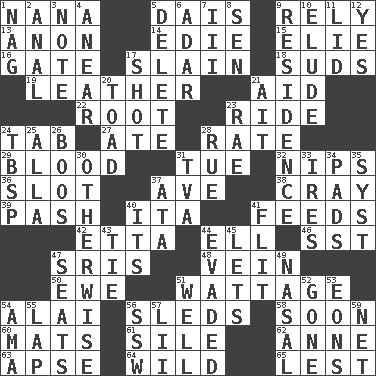 ACROSS 1. Grandmother 5. Raised platform 9. Have trust in 13. Soon (poet.) 14. Singer Brickell 15. Writer Wiesel 16. Yard entry 17. Killed 18. Beer foam 19. Cordwainer's material 21. Help 22. Carrot, for example 23. Travel on an animal 24. Bar bill 27. Had dinner 28. Pace 29. Vital fluid 31. Third day of the wk. 32. Pinches, bites 36. Narrow, elongated depression 37. "___ Maria" 38. Supercomputer manufacturer 39. Romantic infatuation 40. Call ___ day 41. Eats 42. Singer James 44. Pipe bend 46. Fast jet (abbr.) 47. Indian titles of respect 48. Distinctive style or manner 50. She-sheep 51. Electrical Measurement 54. Jai _ 56. Bobsleighs 58. Within a short period 60. Floor protectors 61. Drop; flow; fall 62. Queen of England 1702-14 63. Domed church section 64. Uncontrolled 65. For fear that DOWN 1. Tired old horse 2. Of or related to the anus 3. Musical sound 4. Approach 5. Keyboard key 6. The sixth month of the Jewish calendar 7. One more than two 8. Elected rep. 9. Home 10. Dodge 11. Flaplike covering 12. It is so 17. Attempt 20. Frog relative 21. Small island 23. Actress Charlotte 24. Cook's measure (abbr.) 25. Silent film actress Nazimova 26. Expressions of contempt or scorn 28. Regret 30. Else 31. Federal power corp. 33. Angers 34. Writing tablets 35. System (abbr.) 37. _ moment's notice (2 wds.) 40. ___ a Wonderful Life 41. Secret move to avoid paying debts 43. Make a knot 44. Dodged 45. Allows 47. Theater features 49. Rhinal 51. Not ill 52. Went 53. Immeasurably long periods of time 54. Housemaid (var.) 55. Infant locale 56. Compass dir. 57. Cards in a Roman deck? 59. Fish or hair follower