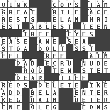 ACROSS 1. Pig sound 5. 911 reaches them 9. Scottish cap 12. Relatively large 14. Cause heat under the collar 15. Adept person 16. Musical pauses 17. Flair 18. Medical imaging device (abbr.) 19. Eastern Standard Time (abbr.) 20. Most capable 23. Adolescent 24. Family _ (genealogy) 25. Snake ____ (dice throw) 27. Relaxation 30. One (Scot) 32. Ocean 33. Portico 34. Dunce 36. Fast jet (abbr.) 38. Snakelike fish 39. To separate or throw off 40. Direct toward a target or goal 43. June honoree 46. Shade of tan 48. Unadorned 49. Friend of Pooh 51. Nine, plus one 52. Proofreading order 53. Letter starter 54. Small quarrel 56. Vintage cars 58. Erase 61. Eisenhower's nickname 64. Increase 65. Actor Lugosi 66. Keyboard key 68. Cask 69. Precipitation 70. Prevent from occurring 71. Compass dir. 72. Cassini of fashion 73. Immeasurably long periods of time DOWN 1. Legendary monster 2. Angers 3. A home for chicks 4. Krazy ___ of comics 5. Algonquian 6. Petroleums 7. Food holders 8. Elected rep. 9. Softens 10. 43,560 square feet 11. Chow _ 13. Russian ruler of old 21. Necklace unit 22. Poe poem 23. Afternoon social gatherings 24. Afternoon social gathering 26. Affirmative reply 27. Compass dir. 28. Had dinner 29. Exchanged or delivered for money 31. Choose 35. Cigar-shaped 37. Tense 41. Binary compound 42. Was introduced to 44. Ancient Greek god of war 45. ___ good deed 47. A single undivided whole 48. Science/research agcy. 50. Severe or trying experience 53. Evade 55. Nourish 56. Libertine 57. Locale of original sin 59. Writer Wiesel 60. Austrian-born American filmmaker Fritz 61. "Tell ____ the Marines!" 62. Peachy ____! 63. Blunders 65. Sis' sibling 67. Born
