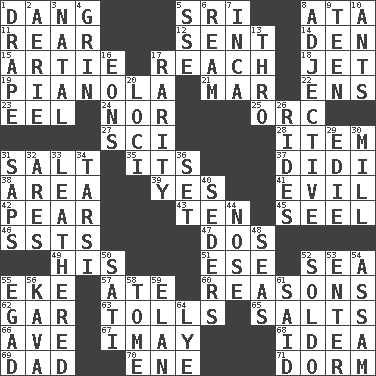 ACROSS 1. Mild oath, euphamism for damn 5. Indian title of respect (Mr.) 8. "One Day ___ Time" 11. Located in or toward the back 12. Emitted 14. Lair 15. Nick name for Arthur 17. Arrive at 18. Type of plane 19. Player piano 21. Third mo. 22. Followers of ems 23. Snakelike fish 24. Not either 25. The grampus (Milton) 27. _-fi 28. A distinct part 31. Table seasoning 35. It is 37. "You Light Up My Life" star Conn 38. Type of rug 39. Consenting reply 41. Tending to cause great harm 42. Lightbulb-shaped fruit 43. Nine, plus one 45. Stitch closed the eyes of (a falcon) 46. Fast planes 47. Two (Sp.) 49. Part of HMS, perhaps 51. Compass dir. 52. Ocean 55. Make supply last 57. Had dinner 60. Thinks logically 62. Slender fish 63. For Whom the Bell _____ 65. Table seasonings 66. "___ Maria" 67. "If ____ say so..." 68. It may be bright or harebrained 69. Male parent 70. Compass dir. 71. Dormintory (informal) DOWN 1. Window treatment 2. Nest on high 3. Relating to or accompanying birth 4. Broad smile 5. Compass dir. 6. 480, 500 or 516 sheets of paper 7. South American Indian 8. Descriptive word 9. Adolescent 10. Pismires 13. Through, poetically 16. Immeasurably long periods of time 17. Noteworthy scarcity 20. Venues 26. Amusement-park features 29. Singer Brickell 30. Place where flour is made 31. Plant excrements 32. Ancient Greek god of war 33. Resembling or made to resemble leather 34. Tarsus (plural) 36. Arrange properly for use 40. Spring feasts 44. Sense of smell 48. Oceans 50. Suttee (variant) 52. Twentieth part of a lira 53. Keyboard key 54. Indian state 55. Mild oath 56. Polynesian shrub of the pepper family 58. Heavy book 59. Liveliness 61. Expressed in words 64. Potassium hydroxide