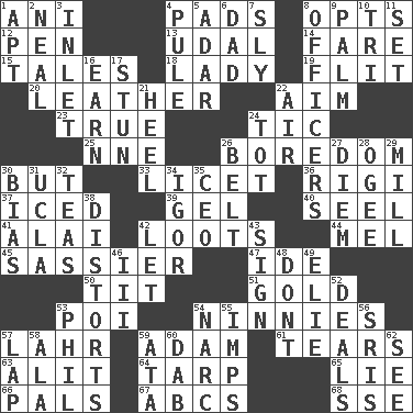 ACROSS 1. Black tropical American cuckoo 4. Writing tablets 8. Chooses 12. Fenced enclosure 13. Hereditary estate 14. Conductor's collection 15. Lies 18. Kenny Rogers chart-topper in '80 19. Sudden quick movement 20. Cordwainer's material 22. Direct toward a target or goal 23. Loyal 24. Nervous spasm 25. Compass dir. 26. Mood resulting from idleness 30. Yet 33. It is permitted: Lat. 36. Swiss mountan, "Queen of the Mountains" 37. On the rocks 39. Set 40. Sew up the eyelids of hawks and falcons 41. Jai ____ 42. Plunders 44. Cartoonist voice _ Blanc 45. More disrespectful 47. Binary compound 50. Teat (slang) 51. Gilded 53. Luau course 54. Simpletons 57. Cowardly lion portrayer 59. First of billions? 61. Pulls into pieces 63. Set down 64. Canvas cover 65. Whopper 66. Friends 67. Lettered men learn these first 68. Compass dir. DOWN 1. Fitting 2. Be tempered by heat 3. An arm off of a larger body of water 4. Whine 5. The sixth month of the Jewish calendar 6. Male parent 7. Wily 8. Persons of authority 9. Inside of hand 10. Three (prefix) 11. Arrange properly for use 16. Merit 17. Make senseless or dizzy 21. Person who is morally reprehensible 22. Wind 24. Small child 26. Waist strap 27. South Vietnam president (1954) 28. Double curve, resembling the letter S 29. Place where flour is made 30. Prejudice 31. Southern CA. univ. 32. Afternoon social gatherings 34. Russian composer Stravinsky 35. Corporate head (abbr.) 38. What propaganda does 42. Allow 43. Signal 46. One more than two 48. Do not 49. Writer Wiesel 52. Allots cards 53. Silvers or Donahue 54. Drug cop 55. Naughty children 56. Indian titles of respect 57. Infant locale 58. Chicken ___ king 59. "One Day ___ Time" 60. Small moist lump or mass 62. Observe