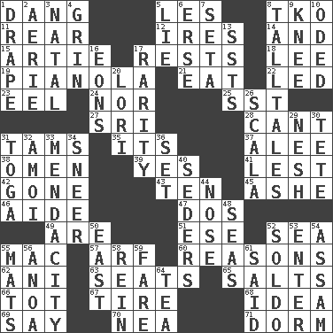 ACROSS 1. Mild oath, euphamism for damn 5. French article 8. Ring climax 11. Tail end 12. Angers 14. Plus 15. Nick name for Arthur 17. Musical pauses 18. Area sheltered from the wind 19. Player piano 21. Ingest 22. Directed 23. Snakelike fish 24. Not either 25. Fast jet (abbr.) 27. _ Lanka 28. Patter 31. Scottish caps 35. It is 37. Toward shelter 38. Presage 39. It is so 41. For fear that 42. Went 43. "___ Little Indians" 45. American tennis player Robert 46. Helper 47. Two (Sp.) 49. "We ___ not amused" (Victoria) 51. Compass dir. 52. Ocean 55. Big _ 57. Sandy's bark 60. Thinks logically 62. Black tropical American cuckoo 63. Theater features 65. Table seasonings 66. Small child 67. Become fatigued 68. It may be bright or harebrained 69. Declare 70. Teachers' org. 71. Dormintory (informal) DOWN 1. Window treatment 2. Nest on high 3. Brizilian seaport 4. Amused look 5. Falsehood 6. Celtic language 7. Bristle 8. Baron Munchausen's specialties 9. Leg joint 10. Wrote a lyric poem 13. Fast planes 16. Immeasurably long periods of time 17. Noteworthy scarcity 20. Australian parrot (variant) 26. Any of the three canals of the cochlea 29. Tender 30. Wig 31. Ancient Roman robe 32. Mine, in Marseilles 33. Ananias' fault 34. Scornful expression 36. Arrange properly for use 40. Spring feasts 44. Characteristic smell of wine 48. Oceans 50. 90 degrees 52. Twentieth part of a lira 53. Keyboard key 54. Indian state 55. Floor coverings 56. Small Philippine buffalo 58. It's straight from the horse's mouth 59. Conductor's collection 61. Alleged 64. Afternoon social gathering