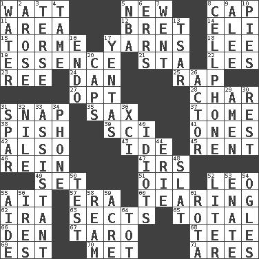 ACROSS 1. Electrical Unit 5. ___ Haven, CT 8. Head covering 11. Length times width 12. Cy Young winner Saberhagen 14. Biblical high priest 15. Singer Mel 17. Tall tales 18. Area sheltered from the wind 19. Gist 21. R.R. building 22. French article 23. To riddle 24. One of the 12 tribes of Israel 25. Hit sharply and swiftly 27. Choose 28. Burn to charcoal 31. Fastener 35. Saxophone 37. Heavy book 38. Expression of disdain 39. _-fi 41. Washington bills 42. In addition 43. Binary compound 45. Monthly bill 46. It's straight from the horse's mouth 47. Big collection agency 49. Put into a specified state 51. Lubricate 52. Lion 55. Small island 57. Period 60. Separating forcefully 62. Lyricist Gershwin 63. Religious groups 65. "_____ Recall" 66. Lair 67. Edible starchy tuberous root 68. False hair 69. Eastern Standard Time (abbr.) 70. Was introduced to 71. Ancient Greek god of war DOWN 1. Wetness 2. Came up 3. Laconic 4. Not wild 5. Basketball assoc. 6. Blunders 7. Left 8. Portable communications device 9. Toward shelter 10. Sliced desserts 13. Russian ruler of old 16. Inside; within (prefix) 17. Gossips 20. Balmoral and tarboosh 26. Thespian 29. So be it 30. Relief 31. Practice fight 32. The longest river in the world 33. Aide 34. Give a jingle 36. One more than ninety 40. Foolish or stupid persons 44. 4th largest of the Great Lakes 48. Narrow board 50. Trial 52. 61 cubic inches 53. Related on the mother's side 54. Stares at amorously 55. Helper 56. Angers 58. 480, 500 or 516 sheets of paper 59. 43,560 square feet 61. Round or rotation of duties 64. Small child