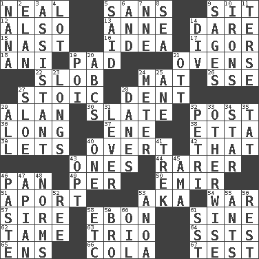 ACROSS 1. Be tempered by heat 5. Without 9. Be seated 12. In addition 13. Queen of England 1702-14 14. Have the gumption 15. Political cartoonist Thomas 16. The content of cognition 17. Russian composer Stravinsky 18. Black tropical American cuckoo 19. Writing tablet 21. Baking chambers 22. Messy guy 24. Floor protector 26. Compass dir. 27. Unemotional 28. Gouge 29. Actor Alda or Thicke 30. Schedule 32. Mail 36. Having great length 37. Compass dir. 38. Singer James 39. Allows 40. Unconcealed 42. Not this but _ 43. Washington bills 44. Less widely known 46. Baking dish 49. For each 50. Independent ruler or chieftain 51. To the left, to Queeg 53. Alias (abbr.) 54. Armed conflict 57. The founder of a family 58. Inky black, to poets 61. Trig term 62. Not wild 63. Musical group of three 64. Fast planes 65. Followers of ems 66. Root beer relative 67. Trial DOWN 1. Nanny 2. Liveliness 3. Aide 4. Car dealer's back yard 5. Stated 6. Also 7. Compass dir. 8. Ocean 9. Gurus 10. Metal shackles 11. Laconic 14. HTML Container Element 19. Luau course 20. Lettered men learn these first 21. Baseball player Mel 23. Yearns 24. Distance measurement 25. One (Scot) 27. A type of plum 28. Natives or inhabitants of Denmark 29. Everything 31. Crowbar 32. _ dish (used to culture cells) 33. Else 34. Play the lead 35. Make lace 40. Single 41. Long journey 43. Choose 45. Wet nurse (var.) 46. Thick mixture 47. Bee-related 48. Typical standards 52. To separate or throw off 53. Small Philippine buffalo 55. Pismires 56. Respite 58. And so on (abbr.) 59. Sis' sibling 60. Petroleum 61. Fast jet (abbr.)