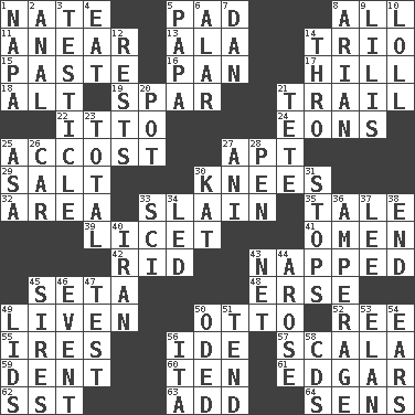 ACROSS 1. Nathan's nickname 5. Writing tablet 8. Everything 11. Approach 13. Wing 14. Musical group of three 15. Thick mixture 16. Baking dish 17. Land elevation 18. The first octave above the treble staff 19. Practice fight 21. Lag or linger behind 22. "Tell ____ the Marines!" 24. Immeasurably long periods of time 25. Buttonhole 27. Fitting 29. Table seasoning 30. Leg joints 32. Length times width 33. Killed 35. Lie 39. It is permitted: Lat. 41. Sign of things to come 42. To free from 43. Slept 45. Stalk of a moss capsule 48. Celtic language 49. Make or become more lively 50. Von Bismarck 52. Portuguese money of account (variant) 55. Angers 56. Binary compound 57. Any of the three canals of the cochlea 59. Gouge 60. Nine, plus one 61. _ Allan Poe 62. Fast jet (abbr.) 63. Increase 64. Elected reps. DOWN 1. California wine valley 2. Of or related to the anus 3. One of the two male reproductive glands 4. Erode 5. Dad 6. Having or resembling wings 7. One of the 12 tribes of Israel 8. Believer in; advocate of (suffix) 9. Ms. Damita and namesakes 10. Hang loosely or laxly 12. Musical pauses 14. Through, poetically 20. Cooking vessel 21. False hair 23. "_____ Recall" 25. White ___ sheet 26. Auto 27. Cuckoo 28. Animal enclosure 30. Krazy ___ of comics 31. Obstructs or blocks passage 33. _-fi 34. Directed 36. Electrical Measurement 37. Area sheltered from the wind 38. Conclude 40. SW Asia republic 43. Remaining after all deductions 44. Came up 45. Founders of families 46. Incident 47. Trial 49. Flaplike coverings 50. Wrote a lyric poem 51. Watch over 53. Liveliness 54. Hearing organs 56. Call ___ day 58. Music discs