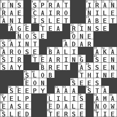ACROSS 1. Followers of ems 4. Small fatty European fish 9. SW Asia republic 13. Actress Charlotte 14. Capital of Egypt 15. "Death on the ____" 16. Cuckoo 17. Small island 18. Collude with 19. Personal question 21. Afternoon social gathering 22. Remove soap 24. Characteristic smell of wine 26. Single 27. Inhabitant of Heaven 29. The sixth month of the Jewish calendar 30. Came up 31. Indonesian resort city 33. Alias (abbr.) 36. Title for a knight 37. Rending 40. Elected rep. 41. Declare 42. Cy Young winner Saberhagen 43. NE Netherlands city 45. Oscar Madison type 47. One or ones belonging to thee 48. A really long time 49. Perceives with the eye 50. Not well drained, as in land 52. American Automobile Association (abbr.) 54. R.R. building 56. Sharp bark 57. Ms. Damita and namesakes 59. Nanny (var.) 61. Relaxation 62. Peak District village in England 63. At this time 64. Downhill vehicle 65. Laconic 66. Make a knot DOWN 1. Epoch 2. Grandmother 3. Signiory (variant) 4. _-fi 5. Thick mixture 6. Cause heat under the collar 7. Type of rug 8. Small child 9. More lacking in sense or substance 10. Teases 11. Toward shelter 12. Remaining after all deductions 20. Immeasurably long periods of time 22. "The Thinker" sculptor 23. _ tizzy (2 wds.) 25. Proofreading order 27. Backtalk 28. Operatic vocal solo 29. Set down 31. Sharp remark 32. "We ___ not amused" (Victoria) 33. Aide 34. Peachy ____! 35. Queen of England 1702-14 38. Black 39. Yard entry 44. "______ My Girl" (Turtles hit) 45. Oozed 46. Chop off 49. Travels by water 50. Lick closed 51. Otherwise 52. Helper 53. Having or resembling wings 55. Mine, in Marseilles 56. It is so 57. Allow 58. Perceive with the eye 60. Deep reverence