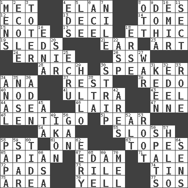 ACROSS 1. Was introduced to 4. Style 8. Lyric poems 12. Environmental prefix 13. Tenth: prefix 14. Heavy book 15. Observe 17. Sew up the eyelids of hawks and falcons 18. Value system 19. Bobsleighs 21. Ewer handle 23. Tate display 24. Bert's buddy 26. Compass dir. 28. Bowlike part 30. Orator 34. Santa ___, CA 37. State of inaction 39. Make new 40. Allow head to fall sleepily 41. Extremist 43. Snakelike fish 44. At sea 46. Den 47. Compass dir. 48. Small, flat, pigmented spot on the skin 51. Lightbulb-shaped fruit 54. Alias (abbr.) 55. Make a splashing sound 58. Pacific Standard Time (abbr.) 61. Single 63. Drinks excessively 65. Bee-related 67. Dutch treat 71. Falsehood 72. Groovy apts. 73. Cause heat under the collar 74. Metal container 75. Type of rug 76. Shout 77. Distress signal DOWN 1. Not women's 2. Learning spot: Fr. 3. Carrier 4. Begley and Asner 5. Area sheltered from the wind 6. Adept person 7. The longest river in the world 8. Baseball player Mel 9. Capital of the state of Qatar 10. Arab leader 11. Religious group 16. Pulitzer Prize-winning author Ferber 18. Celtic language 20. Title for a knight 22. Viper 25. Shade of tan 27. Armed conflict 29. Phone greeting 30. Remove all contents or possession from 31. Peachy ____! 32. Locale of original sin 33. Hero or heavy, e.g. 34. Of or related to the anus 35. Olfactory organ 36. An important port of Yemen 38. R.R. building 42. Ancient Greek god of war 45. "One Day ___ Time" 49. Picture 50. Separate the seeds from cotton 52. The first octave above the treble staff 53. Carrot, for example 56. Arguments over trivial matters 57. Sun: prefix 58. Dad 59. Practice fight 60. Periodic rise and fall of the sea level 62. Suggestive of the supernatural 64. Elected reps. 66. White ___ sheet 68. Expire 69. Everything 70. Cartoonist voice _ Blanc