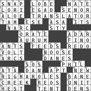 ACROSS 1. Fastener 5. Ear part 9. Nathan's nickname 13. Australian parrot (variant) 14. Mild oath 15. Sir (Sp.) 16. Medicinal plant 17. Interpreter 19. Scottish cap 20. Compass dir. 21. White ___ sheet 22. ___ a Wonderful Life 23. Drug cop 25. Filthy place 26. Speak pompously 30. The sixth month of the Jewish calendar 34. Gold (Symbol: Au) 35. Fine (Spanish) 36. Pismires 39. Gives food to 42. Make new 43. Electrical Unit 44. Trap for birds or small mammals 46. Curves 47. Natives or inhabitants of Denmark 48. Distress signal 51. Silvers or Donahue 54. "One Day ___ Time" 57. One of the 12 tribes of Israel 58. Fitting 60. ___ Haven, CT 62. Frustrating wastes of time 65. Object of repulsion 66. Small stream 67. Vintage cars 68. A single undivided whole 69. Behest 70. Portable shelter 71. Hiding places for outlaws DOWN 1. Narrow board 2. Pitcher Ryan 3. Scent 4. Sliced dessert 5. Allows 6. Legendary monster 7. Sound made by sheep 8. Ferber et al. 9. Teachers' org. 10. Against 11. A blast of a horn 12. Blunders 15. Kill 18. Fast jet (abbr.) 20. Shade of tan 24. Exposes to great heat 27. Sandy's bark 28. Third day of the wk. 29. Make improvements or corrections to 30. Anew 31. Expire 32. Plus 33. Friend of Pooh 36. Actress Gardner 37. And not 38. Affectionate concern, for short 40. ___ good deed 41. Male child 45. Back-to-school mo. 48. Neighbor of Neb. 49. Rowing implement 50. Derisive sound 52. Empty; void 53. Soviet premier 1918-24 54. Bowlike part 55. Become fatigued 56. Eras 58. A really long time 59. Inconspicuous attention getter 61. Moistens 63. Was introduced to 64. Area sheltered from the wind 65. Partially opened flower