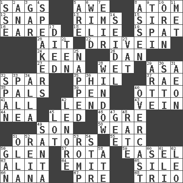 ACROSS 1. Droops 5. Deep reverence 8. Smallest unit of an element 12. Fastener 13. Basketball hoops 15. Male parent of an animal 16. Having ears or earlike features 18. Writer Wiesel 19. Argument over a trivial matter 20. Small island 22. Popular '50s hangout 24. Peachy ____! 26. Daniel's nick name 27. Pulitzer Prize-winning author Ferber 28. Soggy 29. White ___ sheet 32. Coast Guard woman 35. Silvers or Donahue 37. Actress Charlotte 38. Friends 39. Animal enclosure 40. Von Bismarck 41. 100% 42. Grant temporary use of 43. Distinctive style or manner 44. Teachers' org. 45. Directed 46. Legendary monster 49. Manchild 50. Put on (as clothing) 51. Speakers 55. And so on (abbr.) 56. Small, secluded valley 57. Roll call or roster of names 59. Artist's stand 63. Came down and settled, as after flight 64. Send forth 65. Drop; flow; fall 66. Nanny 67. Before (prefix) 68. Musical group of three DOWN 1. Compass dir. 2. Santa ___, CA 3. Slender fish 4. Orators 5. "We ___ not amused" (Victoria) 6. Uncontrolled 7. Independent ruler or chieftain 8. NE Netherlands city 9. Native american tent (variation) 10. Northwest Algerian city 11. Was introduced to 14. Beer mug 17. Passed on 21. Nine, plus one 23. Large container 25. Slept 28. Light entry point 29. Johnson of "Laugh-In" 30. Suttee (variant) 31. A really long time 32. Connect, as a bridge 33. Diluted with white 34. Silent film actress Nazimova 36. Layer 40. Cloudy 42. Poe poem 45. Car dealer's back yard 47. Turn to the right 48. Assign a rank or rating to 49. Before Barbara or Clara 51. Water jar 52. It's straight from the horse's mouth 53. Play 54. Commotion 56. Separate the seeds from cotton 58. Had dinner 60. Title for a knight 61. Connecticut Ivy Leaguer 62. Lion
