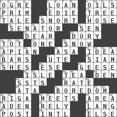 ACROSS 1. Legendary monster 5. Grant temporary use of 9. Lubricates 13. Demure 14. Singer Brickell 15. Family _ (genealogy) 16. Story 17. Derisive sound 18. Stockings 19. Elected representative 21. Elected rep. 22. Letter starter 23. Dinghy 24. Small child 27. Single 28. Overwhelm 29. Bee-related 31. White ___ sheet 32. It may be bright or harebrained 36. Long, evenly shaped pieces 37. Shoshoni 38. Thailand, formerly 39. "______ My Girl" (Turtles hit) 40. Compass dir. 41. Honkers 42. Capri or Wight 44. Beverage made from leaves 46. Lair 47. Fast planes 48. Pace 50. "One Day ___ Time" 51. Mood resulting from idleness 54. Port city in Latvia 56. Confronts 58. Length times width 60. Arabian gulf 61. Trust 62. Austrian-born American filmmaker Fritz 63. Mail 64. International (abbr.) 65. Otherwise DOWN 1. Elect 2. Pate de foie ____ 3. Cause heat under the collar 4. Make improvements or corrections to 5. Poe poem 6. Scent 7. Wind 8. Fish or hair follower 9. Else 10. Literary sarcasm 11. French article 12. Perceive with the eye 17. Comedian Laurel of Laurel & Hardy 20. Period of immesurable duration 21. "Barney Miller" actor Jack 23. Heredity factor (abbr.) 24. Bar bills 25. Brightly colored fish 26. Hoop that covers a wheel 28. Compass dir. 30. Aide 31. Had dinner 33. Passed on 34. Comfort 35. So be it 37. Purpose 40. Raised railways 41. Yard entry 43. R.R. building 44. Trinitrotoluene 45. Hearing organs 47. Gurus 49. Peak District village in England 51. Waist strap 52. Spoken 53. Not women's 54. Strike 55. Wedding promise 56. Medical imaging device (abbr.) 57. Car or cant ending 59. Grow older