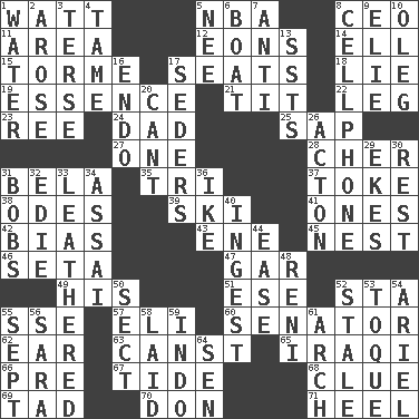 ACROSS 1. Electrical Unit 5. Basketball assoc. 8. Corporate head (abbr.) 11. Length times width 12. Immeasurably long periods of time 14. Pipe bend 15. Singer Mel 17. Theater features 18. Whopper 19. Substance 21. Teat (slang) 22. Part of a journey 23. To riddle 24. Male parent 25. Plant excrement 27. Single 28. "Mermaids" star 31. Actor Lugosi 35. Three (prefix) 37. Puff or smoke 38. Lyric poems 39. What Jean-Claude Killy likes to do 41. Singles 42. Prejudice 43. Compass dir. 45. A home for chicks 46. Bristle 47. Slender fish 49. Part of HMS, perhaps 51. Compass dir. 52. R.R. building 55. Compass dir. 57. Biblical high priest 60. Legislator 62. Ewer handle 63. 2nd pers. sing. pres. of can (arch.) 65. Resident of Iraq 66. Before (prefix) 67. Periodic rise and fall of the sea level 68. A slight indication 69. Bit 70. Spanish title 71. Person who is morally reprehensible DOWN 1. Wetness 2. Came up 3. Laconic 4. Docile 5. Born 6. Water vessel 7. Opposed to 8. Portable communications device 9. Writer Wiesel 10. Cassini of fashion 13. Fast planes 16. Inside; within (prefix) 17. Spring feasts 20. Patter 26. 13-14th century defensive garment 29. Supplements with great effort 30. Respite 31. Moves up and down 32. Singer Brickell 33. Tough but pliablecoriaceous 34. Slender Brazilian palm 36. Mamie's mate 40. Consume 44. Comfort 48. Painter Guido (1575-1642) 50. Religious group 52. Having lost freshness 53. Woman's close-fitting hat 54. Satellite of Uranus 55. Back-to-school mo. 56. "Two Mules for Sister ____" 58. Put down 59. Southeast Asian peninsula 61. Bowlike part 64. Elected rep.