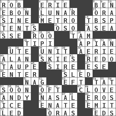 ACROSS 1. Director Reiner 4. One of the Great Lakes 8. Benjamin's nick name 11. Inky black, to poets 13. Type of eclipse 15. Mouth or opening 16. Trig term 17. Paris' subway 18. Cook's measure (abbr.) 19. Portable shelters 21. Bear (Spanish) 22. Toward the sea 23. Compass dir. 24. Friend of Pooh 27. Scottish cap 29. Native american tent (variation) 30. Bee-related 34. Shoshoni 36. A single undivided whole 39. Nest on high 40. Actor Alda or Thicke 41. Atmospheres 43. Do over again 44. Grayish beige 46. Title for a man of rank and authority 47. Compass dir. 48. Keyboard key 49. Downhill vehicle 51. Tired old horse 53. Bank Draft (abbr.) 54. Make lace 57. Within a short period 60. Often (poetically) 63. Garlic unit 65. "60 Minutes" Commentator Rooney 66. Relating to the nose 69. Greek god of love 70. Frozen water 71. Related on the mother's side 72. Give off 73. Directed 74. Mouths or openings 75. Begley and Asner DOWN 1. Musical pauses 2. Off-Broadway awards 3. Child's nurse 4. Shade tree 5. Sorrow 6. To the inside or interior of 7. Hearing organs 8. Moves up and down 9. Celtic language 10. California wine valley 12. Fish or hair follower 14. Carrot, for example 18. ________ with (broke a safety seal) 20. Indian title of respect (Mr.) 25. Musical composition 26. Pig sounds 28. Auto club (abbr.) 29. 3-inch nail 31. Angers 32. Helper 33. Modern: prefix 34. Uhlan (variant) 35. Pulled tight 37. One more than two 38. Laconic 40. Had dinner 42. Oneself 45. Epoch 50. And so on (abbr.) 52. Went 54. Singer Mel 55. Keep away from 56. Trials 57. Travel by water 58. Single time 59. Wrote a lyric poem 61. Papal veil 62. Russian ruler of old 64. Area sheltered from the wind 67. "One Day ___ Time" 68. French article