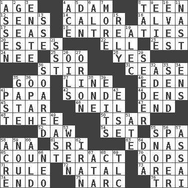ACROSS 1. Mature 4. First man 8. Adolescent 12. Elected reps. 14. Bodily heat indicating an inflammation 16. Inventor's middle name 17. Oceans 18. Pleas 20. _____ Park, CO 22. Pipe bend 23. Eastern Standard Time (abbr.) 24. Born 25. "Barney Miller" actor Jack 28. Affirmative reply 30. Tumult 31. Desist 35. Thick or sticky substance 37. Actor's bit 40. Genesis locale 41. Dad 42. Message 44. Lairs 45. Play the lead 46. Famous astronaut Armstrong 47. Conclude 48. Giggle 50. Russian ruler of old 52. Fool 54. Put into a specified state 55. Health resort 58. Santa ___, CA 61. _ Lanka 63. Ferber et al. 65. Act in opposition 70. I made a mistake 71. General guideline 72. Brizilian seaport 73. Length times width 74. Inside; within (prefix) 75. Drug cop 76. Three (prefix) DOWN 1. NE Netherlands city 2. Honkers 3. Maternal 4. Adept person 5. Daniel's nick name 6. Keyboard modifier key 7. Greater amount 8. Make lace 9. Writer Wiesel 10. Nights before holidays 11. Political cartoonist Thomas 13. Compass dir. 15. Trust 19. Actor Baldwin 21. Fast jet (abbr.) 26. Petroleums 27. Greek mythologigal hunter 29. Sowing specialist 30. Flew 32. An important port of Yemen 33. Transmit 34. Followers of ems 35. Yard entry 36. Brightly colored fish 38. Compass dir. 39. Prepares for publication 41. Pacific Standard Time (abbr.) 43. Otherwise 49. Compass direction 51. Had dinner 53. Songbird 55. Derisive sound 56. Some stationery 57. Slender Brazilian palm 58. Land measure 59. Part of speech 60. Old (Scot.) 62. SW Asia republic 64. ___ good deed 66. Modern: prefix 67. _ moment's notice (2 wds.) 68. Auto 69. Affectionate concern, for short