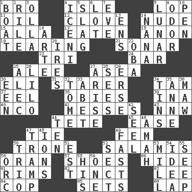 ACROSS 1. Sis' sibling 4. Small island 8. Chop off 11. Petroleum 12. Garlic unit 14. Naked 15. Silent film actress Nazimova 17. Eroded 18. Soon (poet.) 19. Rending 21. Echolocation 23. Three (prefix) 24. Oblong piece of solid material 25. Toward shelter 27. Toward the sea 30. Biblical high priest 31. A viewer who gazes fixedly 34. Scottish cap 37. Snakelike fish 38. Off-Broadway awards 39. _ tizzy (2 wds.) 40. Non-commissioned officer (abbr.) 41. Makes clutter 43. Compass dir. 44. False hair 45. Relaxation 47. Standoff 49. Opposite of masc. 50. Heavy duty weighing machine 52. Deli grouping 56. Northwest Algerian city 57. Imelda's hoard 60. Flintstone garb 61. Basketball hoops 62. Tinged 63. Area sheltered from the wind 64. Police officer (slang) 65. Arranges properly for use 66. Infant locale DOWN 1. Water vessel 2. Cause heat under the collar 3. Spanish pot 4. Ancient Celtic tribe of eastern Britain 5. Volcanic refuse 6. Car dealer's back yard 7. Night before a holiday 8. Type of eclipse 9. Aroma 10. Animal enclosure 13. Followers of ems 14. Grandmother 16. Johnson of "Laugh-In" 20. Angers 22. Chief or king in Benin or Nigeria 25. Actor Baldwin 26. _ and Stitch 27. Ascend 28. Perceives with the eye 29. Celtic language 30. Car or cant ending 32. Heavy book 33. Collude with 34. Airtight sealed metal containers 35. Queen of England 1702-14 36. Opening into something insatiable 42. Sew up the eyelids of hawks and falcons 44. "___ Little Indians" 46. Nanny 47. _____ steamer (cargo ship) 48. Charged atoms 49. Goes without food and/or water 50. Musical group of three 51. Eastern Standard Time (abbr.) 52. Religious group 53. Place where flour is made 54. The content of cognition 55. Ooze 56. The grampus (Milton) 58. Part of HMS, perhaps 59. Single