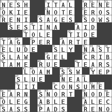 ACROSS 1. Soft 5. Slanted text style (abbr.) 9. French philosopher Descartes 13. Migrant worker of the '30s 14. Musical sound 15. Greek god of love 16. Painter Guido (1575-1642) 17. Gurus 18. Sty mamas 19. French poetic form 21. Assist 22. Lacquered or enameled metalware 23. Periodic rise and fall of the sea level 24. Label 27. For each 28. Johnson of "Laugh-In" 29. Evade 31. Playfully artful 32. Political cartoonist Thomas 36. Cole _ (cabbage dish) 37. Set 38. Baby bed with high sides 39. Not wild 40. Regret 41. Lacerates 42. Rich soil 44. Compass dir. 46. Slangy assent 47. Turn sharply 48. Anneal 50. One more than two 51. Ingest 54. Merit 56. Derisive sound 58. Connecting point 60. Cassini of fashion 61. Competent 62. Actor Baldwin 63. Backtalk 64. Groovy apts. 65. Western Nevada city DOWN 1. Not either 2. Makes supply last 3. Trig term 4. Robbery 5. Sillier 6. Ancient Roman robe 7. Had dinner 8. French article 9. Home 10. Eat (away) 11. At this time 12. Curvy letter 17. Filth; sediment 20. Drink excessively 21. Small island 23. Attempt to accomplish something 24. Trial 25. Silent film actress Nazimova 26. Island territory of the United States 28. 100% 30. Residences 31. Perceive with the eye 33. Like ___ of sunshine 34. Father 35. Cook's measure (abbr.) 37. Chewing product 40. Actress Charlotte 41. It was, poetically 43. Fr. "Yes" 44. Sounds asleep 45. Transmitted 47. Fathers 49. Type of eclipse 51. Chilled 52. Undercover agent 53. Locale of original sin 54. Greek goddess of the dawn 55. In the manner of 56. Plant excrement 57. Basketball assoc. 59. Environmental prefix