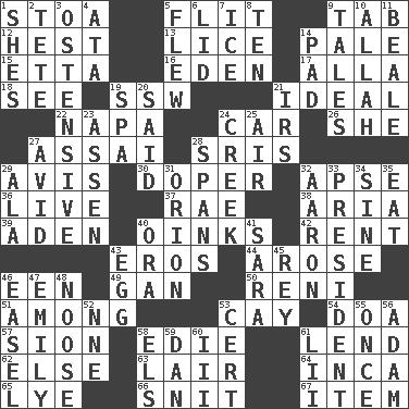 ACROSS 1. Portico 5. Secret move to avoid paying debts 9. Keyboard key 12. Behest 13. Louse (plural) 14. Diluted with white 15. Singer James 16. Locale of original sin 17. Silent film actress Nazimova 18. Observe 19. Compass dir. 21. Standard of perfection 22. California wine valley 24. Auto 26. A female animal or person 27. Slender Brazilian palm 28. Indian titles of respect 29. Deliberation 30. Drug addict 32. Domed church section 36. Not recorded 37. Actress Charlotte 38. Roberta Peters solo 39. An important port of Yemen 40. Pig sounds 42. Monthly bill 43. Greek god of love 44. Came up 46. Car or cant ending 49. Separate the seeds from cotton 50. Painter Guido (1575-1642) 51. Amid 53. Island 54. ___ good deed 57. The Jewish people; Israel 58. Singer Brickell 61. Grant temporary use of 62. Otherwise 63. Den 64. South American Indian 65. Sodium hydroxide 66. In a ____ (agitated or irritated) 67. Detail DOWN 1. "______ My Girl" (Turtles hit) 2. Wig 3. Clearly or manifestly demonstrative 4. "One Day ___ Time" 5. Soared 6. Hat (slang) 7. Frozen water 8. Nine, plus one 9. Falsehoods 10. Assad's deity 11. Calif. Air Force Base 14. Writing tablet 19. Health resort 20. Expressed in words 21. Big collection agency 23. NE Netherlands city 24. Small stream 25. Atmosphere 27. Enthusiastic 28. Connects, as a bridge 29. Wing 31. Constellation of myth 32. Composer Copland 33. Elected leader of a country 34. Trig term 35. Consume 40. Mouth or opening 41. "Two Mules for Sister ____" 43. Ovum 45. Marina Del _, California 46. Artist's stand 47. Poet Dickinson 48. Trap for birds or small mammals 52. Compass dir. 53. Sure thing 55. Single time 56. First man 58. Raised railways 59. One of the 12 tribes of Israel 60. One more than two 61. Cards in a Roman deck?