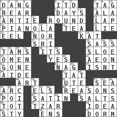 ACROSS 1. Mild oath, euphamism for damn 5. It would 8. Label 11. Posterior 12. 24-hour periods 14. In the manner of 15. Nick name for Arthur 17. Single shot of ammunition 18. Pet locale 19. Player piano 21. Afternoon social gathering 22. Whopper 23. Snakelike fish 24. Not either 25. Krazy ___ of comics 27. Indian title of respect (Mr.) 28. Backtalk 31. Scottish caps 35. It is 37. _ gin 38. Sign of things to come 39. Consenting reply 41. Period of immesurable duration 42. Went 43. Tired old horse 45. Is not 46. Helper 47. Make lace 49. Nonscientific branch of learning 51. Shoshoni 52. Ocean 55. Curve 57. Raised railways 60. Thinks logically 62. Luau course 63. Smooth fabric 65. Table seasonings 66. Small child 67. Czar 68. The main thing one is thinking about 69. Filthy place 70. Followers of ems 71. Dormintory (informal) DOWN 1. Window treatment 2. Nest on high 3. Relating to or accompanying birth 4. Smile widely 5. Wedding promise 6. Tense 7. Unit of force 8. Baron Munchausen's specialties 9. Jai ____ 10. Open wide 13. Neighbor of Neb. 16. Immeasurably long periods of time 17. Noteworthy scarcity 20. Australian parrot (variant) 26. Slender Brazilian palm 29. Within a short period 30. Emitted 31. Ancient Roman robe 32. Mine, in Marseilles 33. Ananias' fault 34. Contemptuous expression 36. Elected rep. 40. Titan orbits this 44. Yard entry 48. Beverages made from leaves 50. Trial 52. Twentieth part of a lira 53. Keyboard key 54. Indian state 55. Tenement units (abbr.) 56. Carrot, for example 58. Goldbrick 59. Comedian Laurel of Laurel & Hardy 61. Expressed in words 64. Big collection agency