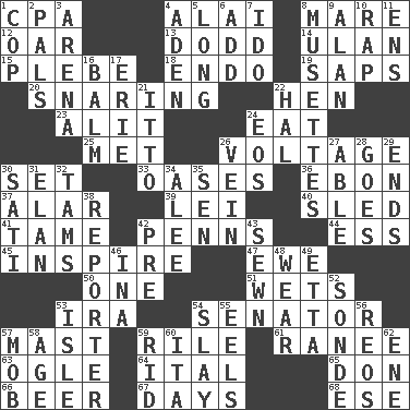 ACROSS 1. Tax preparer (abbr.) 4. Jai ____ 8. Female horse 12. Boat paddle 13. Texas town _ City 14. ____ Bator 15. Military trainee 18. Inside; within (prefix) 19. Plant excrements 20. Catching in a trap 22. Layer 23. Set down 24. Consume 25. Was introduced to 26. Electrical Measurement 30. Arrange properly for use 33. Fertile tracts in a desert 36. Inky black, to poets 37. Having or resembling wings 39. Luau accessory 40. Downhill vehicle 41. Not wild 42. Actor Sean's family 44. Curvy letter 45. Stimulate to action 47. She-sheep 50. Single 51. Moistens 53. Lyricist Gershwin 54. Elected representative 57. Vertical spar for supporting sails 59. Cause heat under the collar 61. Indian princess (variant) 63. Stare 64. Slanted text style (abbr.) 65. Spanish title 66. Fermented drink made from hops 67. 24-hour periods 68. Compass dir. DOWN 1. Police officer (slang) 2. Friends 3. Sports stadium 4. An important port of Yemen 5. Having great length 6. Find the sum of 7. Wedding promise 8. French bagpipes 9. Actor Alda or Thicke 10. Reproach for some lapse or misdeed 11. Followers of ems 16. Lip ointment 17. One of the Great Lakes 21. "Tell ____ the Marines!" 22. Actor Linden 24. Greek goddess of the dawn 26. Distinctive style or manner 27. Competent 28. Leaves 29. Extremities 30. Suttee (variant) 31. Liveliness 32. Scottish caps 34. Toward shelter 35. Elected rep. 38. Newsperson 42. Before (prefix) 43. Stitched 46. _ tizzy (2 wds.) 48. Erode 49. Singer James 52. Message 53. Capri or Wight 54. Kill 55. Snakelike fish 56. Vintage cars 57. Disorderly crowd 58. Personal question 59. To free from 60. Call ___ day 62. Compass dir.