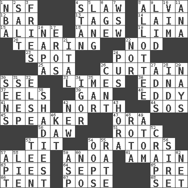 ACROSS 1. Science/research agcy. 4. Cole _ (cabbage dish) 8. Inventor's middle name 12. Long, evenly shaped piece 13. Labels 14. (Had) reclined 15. Place in a line 18. Afresh 19. Pale green bean 20. Lacerating 22. Lower and raise head in agreement 23. Specific locale 24. Plant holder 25. White ___ sheet 26. Window treatment 30. Compass dir. 33. Citrus fruits 36. Pulitzer Prize-winning author Ferber 37. Snakelike fish 39. Separate the seeds from cotton 40. Whirlpool 41. Delicate 42. _ pole 44. Mayday 45. Orator 47. Mouth or opening 50. Fool 51. College mil. group 53. Teat (slang) 54. Speakers 57. Toward shelter 59. Small Philippine buffalo 61. With great haste 63. Sliced desserts 64. Back-to-school mo. 65. Before (prefix) 66. Portable shelter 67. Airs 68. Arrange properly for use DOWN 1. Basketball assoc. 2. Table seasoning 3. Strips of potato fried in deep fat 4. Comedian Laurel of Laurel & Hardy 5. Austrian-born American filmmaker Fritz 6. Ripen 7. Compass dir. 8. One to whom something is allotted 9. Put down 10. Zeal 11. Santa ___, CA 16. California wine valley 17. Greek god of love 21. Slanted text style (abbr.) 22. And not 24. Product of festering 26. Penny 27. Sums up 28. _ china 29. Negative votes 30. Elected reps. 31. Ooze 32. Otherwise 34. Russian composer Stravinsky 35. Impair 38. Most dubious of character or honesty 42. ___ Haven, CT 43. Israeli folk dance 46. Krazy ___ of comics 48. Round or rotation of duties 49. Smallest unit of an element 52. Dice game 53. Adolescent 54. I made a mistake 55. Assign a rank or rating to 56. Male parent of an animal 57. Fitting 58. Falsehood 59. Viper 60. Modern: prefix 62. Fish or hair follower