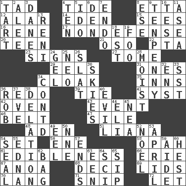 ACROSS 1. Small amount or degree 4. Periodic rise and fall of the sea level 8. Singer James 12. Having or resembling wings 14. Genesis locale 15. Perceives with the eye 16. French philosopher Descartes 17. Unrelated to defense, as in spending 20. Adolescent 21. Bear (Spanish) 22. Parent Teacher Association (abbr.) 23. Attaches a signature 27. Heavy book 29. Snakelike fish 31. Singles 34. Covering 35. Restaurants 36. Make new 39. Neckwear 41. System (abbr.) 42. Baking chamber 43. Happening 46. Waist strap 47. Filth; sediment 48. An important port of Yemen 51. Climbing, woody, usually tropical vines 54. Arrange properly for use 56. Compass dir. 58. Brightly colored fish 61. The property of being fit to eat 66. 4th largest of the Great Lakes 67. Small Philippine buffalo 68. Tenth: prefix 69. Hats (slang) 70. Long (Scottish) 71. Sever or remove by pinching or nipping 72. Allow DOWN 1. Small pie 2. Toward shelter 3. Natives or inhabitants of Denmark 4. "___ Little Indians" 5. Wedding promise 6. Lair 7. Inside; within (prefix) 8. Compass dir. 9. 3-inch nail 10. Trial 11. Toward the sea 13. Painter Guido (1575-1642) 18. Eastern Standard Time (abbr.) 19. Egg _ yung 24. Set 25. Modern: prefix 26. Narrow board 28. Wet 30. Atmospheres 32. Followers of ems 33. Fast jet (abbr.) 34. Continued (abbr.) 36. Director Reiner 37. Night before a holiday 38. Accusation by an informer 40. Morally bad or wrong 44. Biblical high priest 45. Teachers' org. 49. Snakelike fish 50. Compass dir. 52. Christmas carol 53. Showery time 54. Lick closed 55. Pulitzer Prize-winning author Ferber 57. Extremities 59. Assistant 60. Command 62. Paper or plastic container 63. Car or cant ending 64. _-fi 65. Small drink