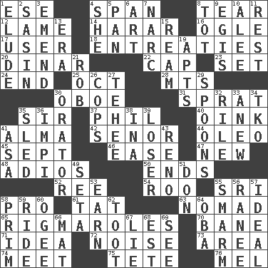 ACROSS 1. Compass dir. 4. Connect, as a bridge 8. Pull apart 12. Unable to walk 14. Ethiopian city, capital of Harari 16. Stare at amorously 17. One who makes use of a thing 18. Pleas 20. Middle Eastern gold or silver currency 22. Head covering 23. Put into a specified state 24. Conclusion 25. Sep. follower 28. Mountains (abbr.) 30. Mitch Miller's instrument 31. Small fatty European fish 35. Title for a knight 37. Silvers or Donahue 40. Pig sound 41. _ mater 42. Sir (Sp.) 44. Butter sub 45. Back-to-school mo. 46. Comfort 47. ___ Haven, CT 48. Goodbye (Sp.) 50. Conclusions 52. To separate or throw off 54. Friend of Pooh 55. Indian title of respect (Mr.) 58. Adept person 61. Make lace 63. Wanderer 65. Frustrating wastes of time 70. Object of repulsion 71. The main thing one is thinking about 72. Annoying sound 73. Type of rug 74. Confront 75. False hair 76. Cartoonist voice _ Blanc DOWN 1. Dodge 2. Indian antelope 3. Make improvements or corrections to 4. A female animal or person 5. Baking dish 6. Tate display 7. Drug cop 8. Small child 9. The front part of a cuirass 10. Toward shelter 11. Repose 13. Epoch 15. 480, 500 or 516 sheets of paper 19. Flats, for short 21. Director Reiner 26. 911 reaches them 27. Giggle 29. Soup utensils 30. Speaker 32. Cause heat under the collar 33. Afresh 34. Ring climax 35. Downhill vehicle 36. Body of Kaffir warriors 38. _ tizzy (2 wds.) 39. Failure 41. White ___ sheet 43. Western Nevada city 49. Stalk of a moss capsule 51. Spanish title 53. Merit 55. Excessive but superficial compliments 56. Indian princess (variant) 57. Perfect 58. Demure 59. Travel on or in a vehicle 60. Double curve, resembling the letter S 62. A blast of a horn 64. Chief or king in Benin or Nigeria 66. Floor covering 67. Untruth 68. Eastern Standard Time (abbr.) 69. Perceive with the eye