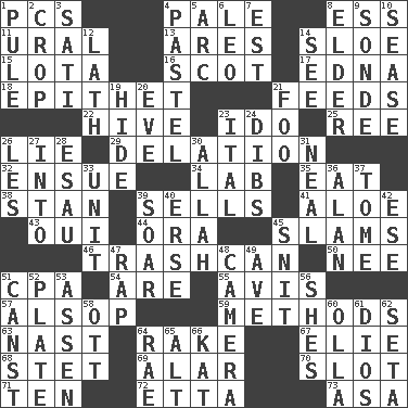 ACROSS 1. Personal Computers (abbr.) 4. Diluted with white 8. Curvy letter 11. Mountain range 13. Ancient Greek god of war 14. A type of plum 15. Globular water bottle used in Asia 16. Highlander 17. Pulitzer Prize-winning author Ferber 18. Curse 21. Eats 22. Hub of activity 23. Wedding promise 25. To riddle 26. Whopper 29. Conveyance 32. Follow as a consequence or result 34. Experiment locale 35. Erode 38. Comedian Laurel of Laurel & Hardy 39. Makes a sale 41. _ vera 43. Fr. "Yes" 44. Mouth or opening 45. Criticizes harshly 46. File 13 50. Born 51. Accounting whiz (abbr.) 54. "We ___ not amused" (Victoria) 55. Opinion 57. Columnist Joseph or Stewart 59. Modes 63. Political cartoonist Thomas 64. Libertine 67. Writer Wiesel 68. Proofreading order 69. Having or resembling wings 70. Groove 71. "___ Little Indians" 72. Singer James 73. White ___ sheet DOWN 1. Whimper 2. Riding implement 3. Suttee (variant) 4. Soft color 5. Curve 6. Lion 7. Eastern Standard Time (abbr.) 8. A person who is older than you are 9. Something which is sent 10. Gospel singer Marvin 12. Thin strip of wood or metal 14. Perceive with the eye 19. Flintstone garb 20. First lady 21. Egg _ yung 23. Slanted text style (abbr.) 24. Rights 26. French article 27. To the inside or interior of 28. Son of Isaac 30. Assad's deity 31. Anneal 33. A single undivided whole 36. Actor Alda or Thicke 37. Heavy book 39. Fly high 40. Celtic language 42. Compass dir. 45. In a ____ (agitated or irritated) 47. Hit sharply and swiftly 48. Device for capturing images 49. "___ Maria" 51. 2nd pers. sing. pres. of can (arch.) 52. Food holder 53. NE Netherlands city 56. "______ My Girl" (Turtles hit) 58. Baseball player Mel 60. Spanish pot 61. "Vaya con ____" 62. Stalk of a moss capsule 64. Actress Charlotte 65. The first octave above the treble staff 66. Krazy ___ of comics