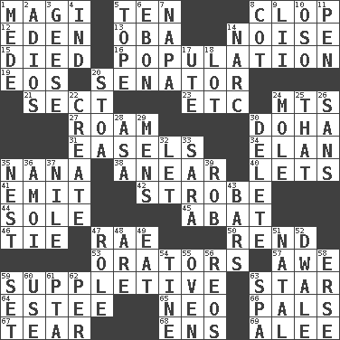 ACROSS 1. Wise men 5. "___ Little Indians" 8. Hoof sound 12. Paradise 13. Chief or king in Benin or Nigeria 14. Annoying sound 15. Passed on 16. Census information 19. Greek goddess of the dawn 20. Elected representative 21. Religious group 23. And so on (abbr.) 24. Mountains (abbr.) 27. Wander 30. Capital of the state of Qatar 31. Artist's stands 34. Liveliness 35. Grandmother 38. Approach 40. Allows 41. Send forth 42. Disco prop 44. Not divided or shared with others 45. Blind as ____ 46. Neckwear 47. Actress Charlotte 50. Tear apart 53. Speakers 57. Deep reverence 59. Supplementary 63. Play the lead 64. First name in cosmetics 65. Modern: prefix 66. Friends 67. Separate forcefully 68. Followers of ems 69. Toward shelter DOWN 1. Ancient Persian 2. Goodbye (Sp.) 3. Honkers 4. Working for oneself (abbr.) 5. Drink excessively 6. Inky black, to poets 7. California wine valley 8. Small bed 9. Cards in a Roman deck? 10. Bear (Spanish) 11. Writing instrument 14. Drug cop 17. Shoshoni 18. Car dealer's back yard 20. Portico 22. Make 24. Undercover agent 25. Not this but _ 26. Without 28. White ___ sheet 29. Not women's 30. Erase 32. Allow 33. "Two Mules for Sister ____" 35. A home for chicks 36. Mine, in Marseilles 37. The longest river in the world 39. Director Reiner 43. Taverns 47. Hero or heavy, e.g. 48. "We ___ not amused" (Victoria) 49. Erode 51. Brizilian seaport 52. A sleeping potion; an opiate (poet.) 54. Prong on a fork 55. Baking chamber 56. Vintage cars 58. Celtic language 59. Arrange properly for use 60. Purpose 61. Parent Teacher Assoc. 62. For each 63. Health resort