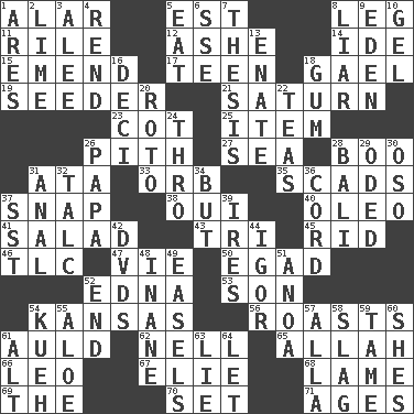 ACROSS 1. Having or resembling wings 5. Eastern Standard Time (abbr.) 8. Part of a journey 11. Cause heat under the collar 12. American tennis player Robert 14. Binary compound 15. Make improvements or corrections to 17. Adolescent 18. Highlander 19. Sowing specialist 21. Titan orbits this 23. Small bed 25. A whole individual unit 26. Heart or essence 27. Ocean 28. Oct. 31 cry 31. _ moment's notice (2 wds.) 33. Globe 35. Oodles 37. Fastener 38. Fr. "Yes" 40. Butter sub 41. First course 43. Three (prefix) 45. To free from 46. Affectionate concern, for short 47. Compete 50. Mild oath 52. Pulitzer Prize-winning author Ferber 53. Boy, to dad 54. Sunflower state 56. Cooks with dry heat, as in an oven 61. Old (Scot.) 62. 1994 drama film starring Jodie Foster 65. Assad's deity 66. Lion 67. Writer Wiesel 68. Unable to walk 69. Definite Article 70. Arrange properly for use 71. Grows older DOWN 1. Ancient Greek god of war 2. Citrus frut 3. Toward shelter 4. Tear apart 5. Consume 6. Compass dir. 7. College paper 8. One who doesn't tell the truth 9. Genesis locale 10. Set 13. Maternal 16. Tenth: prefix 18. Chewing product 20. Printing process, for short 22. Beverages made from leaves 24. Through, poetically 26. Dad 28. Indonesian resort city 29. Wrote a lyric poem 30. Bear (Spanish) 31. Of or related to the anus 32. Baby powder 34. On the contrary 36. Drawstring 37. Fast jet (abbr.) 39. Angers 42. Movie discs 44. Composer Stravinsky 48. Empty; void 49. Artist's stands 51. Small Philippine buffalo 52. Conclusion 54. Malaysian steamed pastry 55. Medicinal plant 57. Silent film actress Nazimova 58. Volcanic refuse 59. Docile 60. "______ My Girl" (Turtles hit) 61. Keyboard modifier key 63. Falsehood 64. Allow