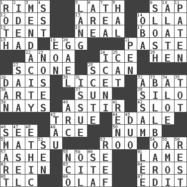 ACROSS 1. Basketball hoops 5. Thin strip of wood or metal 9. Plant excrement 12. Lyric poems 13. Length times width 14. Spanish pot 15. Portable shelter 16. Actress Patricia 17. Water vessel 18. Possessed 19. Oval reproductive body of a fowl 21. Thick mixture 22. Small Philippine buffalo 24. Frozen water 26. Layer 27. Biscuitlike quick bread 28. Examine hastily 29. Raised platform 30. It is permitted: Lat. 32. Blind as ____ 36. Johnson of "Laugh-In" 37. Player for Phoenix 38. Grain storage tower 39. Negative votes 40. Moving or stirring 42. Notch 43. Loyal 44. Peak District village in England 46. Perceive with the eye 49. Adept person 50. Unfeeling 51. Taiwanese island in East China Sea 53. Friend of Pooh 54. Boat paddle 57. American tennis player Robert 58. Sense of smell 61. Unable to walk 62. It's straight from the horse's mouth 63. Quote 64. Greek god of love 65. Affectionate concern, for short 66. Norwegian king 67. Prepare for publication DOWN 1. Writer of Portnoy's Complaint (1969) 2. It may be bright or harebrained 3. Ananias' fault 4. Fast jet (abbr.) 5. Long (Scottish) 6. "We ___ not amused" (Victoria) 7. Afternoon social gathering 8. Actor Linden 9. Agitate, as a liquid 10. Having winglike extensions 11. Eucharist need 14. Chief or king in Benin or Nigeria 19. Period of immesurable duration 20. Highlander 21. Fenced enclosure 23. Olfactory organs 24. Ancient Celtic tribe of eastern Britain 25. Domesticated feline 27. "Two Mules for Sister ____" 28. Scutum 29. Daniel's nick name 31. Come out of 32. Indian state 33. Big road sign 34. _ vera 35. Small child 40. Curve 41. Western Nevada city 43. The 19th letter of the Greek alphabet 45. Superhero pair 46. Don Adams' spy role 47. Artist's stand 48. Value system 52. Elected rep. 53. Coral collection 55. Mine, in Marseilles 56. Repose 58. Non-commissioned officer (abbr.) 59. Petroleum 60. R.R. building 61. Area sheltered from the wind