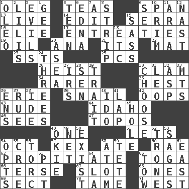 ACROSS 1. Cassini of fashion 5. Afternoon social gatherings 9. Connect, as a bridge 13. Moving, as bait 14. Prepare for publication 15. Spanish missionary in California 16. Writer Wiesel 17. Pleas 19. Petroleum 20. Santa ___, CA 21. ___ a Wonderful Life 22. Floor protector 23. Fast planes 25. Personal Computers (abbr.) 26. Robbery 30. Dollar (slang) 34. More valued for its uncommonness 35. Command 36. 4th largest of the Great Lakes 39. Slow-paced one 42. I made a mistake 43. Naked 44. Potato state 46. Perceives with the eye 47. Literary convention 48. Single 51. Allows 54. Sep. follower 57. Dry husk or covering 58. Had dinner 60. Actress Charlotte 62. Conciliate 65. Ancient Roman robe 66. Laconic 67. Slit 68. Washington bills 69. Religious group 70. Docile 71. Compass direction DOWN 1. Butter sub 2. Ms. Damita and namesakes 3. Vices 4. Unit of force equal to gravity 5. Adolescent 6. Pulitzer Prize-winning author Ferber 7. Small island 8. Remove all contents or possession from 9. Put into a specified state 10. Demure 11. Length times width 12. Political cartoonist Thomas 15. Backtalk 18. And so on (abbr.) 20. At sea 24. Trios 27. Big collection agency 28. Elected rep. 29. Distinguishing feature 30. Elect 31. Lion 32. Cleo's killer 33. Mountains (abbr.) 36. Followers of ems 37. Sorrow 38. Binary compound 40. Wedding promise 41. Pet locale 45. Opening into or through something 48. Migrant worker of the '30s 49. Remaining after all deductions 50. Be 52. Marketplace scale 53. Gurus 54. Chooses 55. Algonquian 56. Torque (variant) 58. Tiny particle 59. Wig 61. Compass direction 63. Pacific Standard Time (abbr.) 64. Insect wing 65. Pull behind