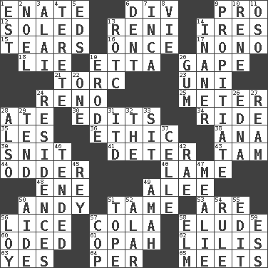 ACROSS 1. Maternal 6. HTML Container Element 9. Adept person 12. Having a sole or soles 13. Painter Guido (1575-1642) 14. Angers 15. Rends 16. Single time 17. Words to Nanette 18. Whopper 19. Singer James 20. Yawn 21. Torque (variant) 23. Corn or form start 24. Former U.S. Attorney General Janet 25. Distance measurement 28. Had dinner 30. Prepares for publication 34. Travel on or in a vehicle 35. French article 36. Value system 38. Santa ___, CA 39. In a ____ (agitated or irritated) 41. Prevent from occurring 43. Scottish cap 44. More peculiar 46. Unable to walk 48. Compass dir. 49. Toward shelter 50. "60 Minutes" Commentator Rooney 51. Docile 53. "We ___ not amused" (Victoria) 56. Louse (plural) 57. Root beer relative 58. Dodge 60. Wrote a lyric poem 61. Brightly colored fish 62. Ms. Damita and namesakes 63. Consenting reply 64. For each 65. Confronts DOWN 1. Eastern Standard Time (abbr.) 2. Christmas carol 3. Mountain range southwest of Kyrgyzstan 4. Cigar-shaped 5. Begley and Asner 6. Gouge 7. South American Indian 8. Compete 9. Appease 10. French philosopher Descartes 11. Bear (Spanish) 13. College mil. group 14. More empty; more void 19. Eat (away) 20. Chewing product 22. Single 24. Dwellings 26. Pulitzer Prize-winning author Ferber 27. 480, 500 or 516 sheets of paper 28. In addition 29. Be inclined (to) 31. It would 32. Definite Article 33. Be seated 37. Cell (Danish) 40. Looked after 42. Actress Charlotte 45. Marina Del _, California 47. Ear of corn 49. Housemaid 50. Assistant 51. Drink excessively 52. Having or resembling wings 54. General guideline 55. Prepare for publication 56. Myrna of the movies 57. Police officer (slang) 58. Shade tree 59. Double-curved letter