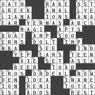 ACROSS 1. Pledge 5. Immoral or dissolute person 9. Fast jet (abbr.) 12. Of Greece 14. Of or related to the anus 15. Potassium hydroxide 16. Climbing, woody, usually tropical vines 17. Charged particles 18. Santa ___, CA 19. Ewer handle 20. Actresses Bloom and Felton 23. Lettered men learn these first 24. Wise men 25. Tenement units (abbr.) 27. Water vessel 30. Electrical Unit 32. "Barney Miller" actor Jack 33. Blunders 34. Dunce 36. Naughty child 38. Basketball assoc. 39. Observe 40. Working for oneself (abbr.) 43. Slangy assent 46. Hearing organs 48. Adolescent 49. Compete 51. Arrange properly for use 52. At sea 53. Fermented drink made from hops 54. Frog relative 56. Greek god of love 58. Severe or trying experience 61. Immediately 64. Lair 65. The content of cognition 66. Empty; void 68. Electrically charged atom 69. Painter Guido (1575-1642) 70. Lugs 71. Compass dir. 72. Does sums 73. Respite DOWN 1. Stare 2. Operatic vocal solo 3. Pull into pieces 4. Layer 5. Precipitation 6. Small Philippine buffalo 7. Sunflower state 8. Raised railways 9. Thick slices 10. Synchronize (abbr.) 11. Afternoon social gatherings 13. Polynesian shrub of the pepper family 21. Mild oath 22. Full of chinks, cracks, or crevices 23. Smallest unit of an element 24. Mountains (abbr.) 26. Luau course 27. Benjamin's nick name 28. Globe 29. Like ___ of sunshine 31. Entreaties 35. Cigar-shaped 37. Sliced desserts 41. Born 42. Heredity factor (abbr.) 44. Nights before holidays 45. Sliced dessert 47. Portico 48. Small amount or degree 50. Eaten away 53. Maid-servant 55. Set down 56. Singer Brickell 57. Vintage cars 59. Tear apart 60. Raised platform 61. Nathan's nickname 62. Singles 63. Compass direction 65. Retirement account (abbr.) 67. Not either