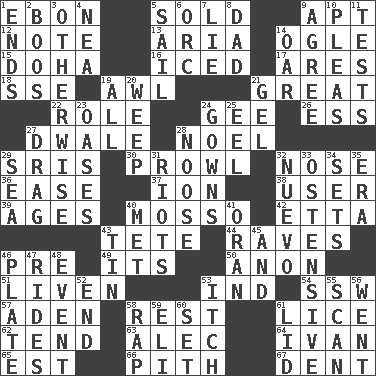 ACROSS 1. Inky black, to poets 5. Exchanged or delivered for money 9. Fitting 12. Observe 13. Operatic vocal solo 14. Stare 15. Capital of the state of Qatar 16. On the rocks 17. Ancient Greek god of war 18. Compass dir. 19. Leather borer 21. Relatively large 22. Hero or heavy, e.g. 24. Turn to the right 26. Double-curved letter 27. A sleeping potion; an opiate (poet.) 28. Christmas carol 29. Indian titles of respect 30. Move like a hungry wolf 32. Olfactory organ 36. Relaxation 37. Electrically charged atom 38. One who uses or employs something 39. Eons 40. With motion or animation 42. Singer James 43. False hair 44. All-night dance parties 46. Before (prefix) 49. It is 50. Soon (poet.) 51. Make or become more lively 53. Indiana (abbr.) 54. Compass dir. 57. Arabian gulf 58. Relief 61. Louse (plural) 62. Be inclined (to) 63. Actor Baldwin 64. "Terrible" tsar 65. Eastern Standard Time (abbr.) 66. Essential or central part 67. Gouge DOWN 1. Extremities 2. Expressions of contempt or scorn 3. Else 4. Teachers' org. 5. Travel by water 6. The grampus (Milton) 7. Falsehood 8. Male parent 9. Match 10. Entreaties 11. Trials 14. Boat paddle 19. Everything 20. Shed a tear 21. Set 23. Fertile tracts in a desert 24. Brides' dresses 25. Snakelike fish 27. To trail on the ground 28. Trap for birds or small mammals 29. Ocean 31. Disturbances 32. New (sp.) 33. Clearly or manifestly demonstrative 34. Puts into a specified state 35. Period 40. Was introduced to 41. Northwest Algerian city 43. Shallow baking pan 45. Added to 46. Food holder 47. Amusement-park features 48. Happening 52. Conclude 53. Hankering 55. Glance over 56. Gone 58. Reproach for some lapse or misdeed 59. Biblical high priest 60. Put into a specified state 61. Flaplike covering