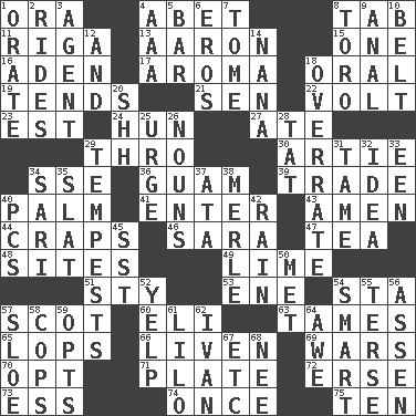 ACROSS 1. Mouth or opening 4. Collude with 8. Bar bill 11. Port city in Latvia 13. Composer Copland 15. Single 16. Arabian gulf 17. Scent 18. Taken by mouth 19. Watches over 21. Elected rep. 22. Electrical Unit 23. Eastern Standard Time (abbr.) 24. Attila the _ 27. Had dinner 29. Through, poetically 30. Nick name for Arthur 34. Compass dir. 36. Island territory of the United States 39. Exchange 40. Inside of hand 41. Keyboard key 43. So be it 44. Dice game 46. "Two Mules for Sister ____" 47. Afternoon social gathering 48. Locates 49. Citrus frut 51. Filthy place 53. Compass dir. 54. R.R. building 57. Highlander 60. Connecticut Ivy Leaguer 63. Softens 65. Chops off 66. Make or become more lively 69. Armed conflicts 70. Choose 71. Food holder 72. Celtic language 73. Double-curved letter 74. At one time in the past 75. "___ Little Indians" DOWN 1. Declaim 2. Amusement-park features 3. Representative 4. Auto club (abbr.) 5. Soap unit 6. Greek god of love 7. Heavy book 8. "Corrida" creature 9. Of or related to the anus 10. Waist strap 12. Plus 14. Nanny 18. Make much ado about nothing 20. Quiet! 25. Goad 26. Parts of speech 28. Make lace 29. Storms 31. Not wild 32. The content of cognition 33. Car or cant ending 34. Indian skirt 35. Narrow board 37. "One Day ___ Time" 38. Haggard of country music 40. Personal Computers (abbr.) 42. Water falling in drops from the sky 45. Fast jet (abbr.) 50. Was introduced to 52. Sharp bark 54. Don Adams' spy role 55. Laconic 56. NE Netherlands city 57. A type of plum 58. 911 reaches them 59. Elects 61. _ and Stitch 62. "Terrible" tsar 64. Deep reverence 67. And so on (abbr.) 68. Born