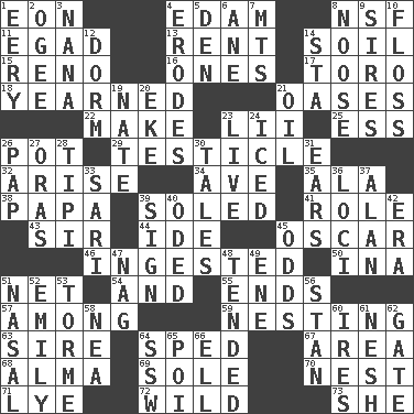ACROSS 1. A really long time 4. Dutch treat 8. Science/research agcy. 11. Mild oath 13. Monthly bill 14. Earth 15. Western Nevada city 16. Singles 17. "Corrida" creature 18. Had a strong desire 21. Fertile tracts in a desert 22. Cause to be 23. Cards in a Roman deck? 25. Curvy letter 26. Cooking vessel 29. A testis 32. Get up 34. "___ Maria" 35. Wing 38. Dad 39. Having a sole or soles 41. Hero or heavy, e.g. 43. Title for a knight 44. Binary compound 45. Witty Wilde 46. Swallowed 50. _ tizzy (2 wds.) 51. Remaining after all deductions 54. Added to 55. Extremities 57. Amid 59. Nestling 63. Father 64. Moved rapidly 67. Type of rug 68. _ mater 69. Not divided or shared with others 70. Egg locale 71. Sodium hydroxide 72. Rampant 73. A female animal or person DOWN 1. Suggestive of the supernatural 2. Double curve, resembling the letter S 3. Nanny 4. Eats (away) 5. Lair 6. A saturated hydrocarbon 7. Mountains (abbr.) 8. Trap for birds or small mammals 9. Male parents of animals 10. Soft thread for cleaning between teeth 12. Dormintory (informal) 14. R.R. building 19. Nathan's nickname 20. Make supply last 21. Petroleum 23. Moving, as bait 24. On the rocks 26. Infant food 27. Mouths or openings 28. Native american tent (variation) 30. Lies 31. Hearing organs 33. Indian skirt 36. Event scenes 37. Actor Alda or Thicke 39. Attach a signature 40. Wrote a lyric poem 42. Period 45. Likelihood 47. Tired old horse 48. Looked after 49. Compass dir. 51. Rhinal 52. Poet Dickinson 53. Singer Mel 56. Comedian Laurel of Laurel & Hardy 58. Teachers' org. 60. Angers 61. Soft 62. Yard entry 64. Compass dir. 65. Luau course 66. Pipe bend