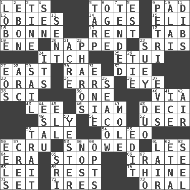 ACROSS 1. Allows 5. Carryall 9. Writing tablet 12. Off-Broadway awards 14. Eras 15. Connecticut Ivy Leaguer 16. Child's nurse 17. Monthly bill 18. Bar bill 19. Compass dir. 20. Slept 23. Indian titles of respect 24. Hankering 25. Needle holder 27. Compass direction 30. Actress Charlotte 32. Expire 33. Mouths or openings 34. Blunders 36. Sight organ 38. _-fi 39. Single 40. By way of 43. Area sheltered from the wind 46. Thailand, formerly 48. Tenth: prefix 49. Secret 51. Environmental prefix 52. One who makes use of a thing 53. Falsehood 54. Margarine 56. Shade of tan 58. Overwhelmed 61. French article 64. Period 65. Halt 66. Feeling or showing extreme anger 68. Luau accessory 69. Remainder 70. One or ones belonging to thee 71. Put into a specified state 72. Angers 73. Relating to the mouth DOWN 1. Ear part 2. Inky black, to poets 3. Prong on a fork 4. Elected rep. 5. Canvas cover 6. Double curve, resembling the letter S 7. Looked after 8. Eastern Standard Time (abbr.) 9. _ dish (used to culture cells) 10. Mountain range southwest of Kyrgyzstan 11. Claim 13. Emitted 21. Land measure 22. N Egypt peninsula 23. Chop _ 24. ___ a Wonderful Life 26. Neckwear 27. Greek goddess of the dawn 28. Curve 29. Travel by water 31. Bert's buddy 35. Manatee 37. Nights before holidays 41. Frozen water 42. Wind 44. Son of Isaac 45. Pipe bend 47. Undercover agent 48. Superhero pair 50. Next before 53. Distinguishing feature 55. Prepare for publication 56. Snakelike fish 57. Algonquian 59. Sense of smell 60. Elects 61. Den 62. Inactive volcano in Sicily 63. Stitch closed the eyes of (a falcon) 65. _ Lanka 67. 17th letter of the Greek alphabet