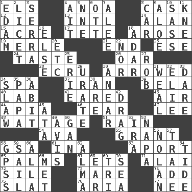 ACROSS 1. Raised railways 4. Small Philippine buffalo 8. Keg 12. Expire 13. International (abbr.) 14. Actor Alda or Thicke 15. 43,560 square feet 17. False hair 18. Came up 19. Haggard of country music 21. Conclusion 23. Compass dir. 24. Clothes sense 26. Boat paddle 28. Shade of tan 30. Moved like an arrow 34. Health resort 37. SW Asia republic 39. Actor Lugosi 40. Experiment locale 41. Having ears or earlike features 43. Wind 44. Capital of Western Samoa 46. Lacerate 47. Area sheltered from the wind 48. Electrical Measurement 51. Precipitation 54. Actress Gardner 55. Let have 58. Girls' org. (abbr.) 61. _ tizzy (2 wds.) 63. To the left, to Queeg 65. Insides of hands 67. Allows 71. Mountain range southwest of Kyrgyzstan 72. Drop; flow; fall 73. Female horse 74. Increase 75. Narrow board 76. Roberta Peters solo 77. Born DOWN 1. Dutch treat 2. It is permitted: Lat. 3. Spanish missionary in California 4. Small island 5. Compass dir. 6. Baseball player Mel 7. Toward shelter 8. 4-wheeled motor vehicle 9. _ vera 10. Backtalk 11. Leg joint 16. Otherwise 18. The sixth month of the Jewish calendar 20. And so on (abbr.) 22. Not either 25. 4th largest of the Great Lakes 27. Director Reiner 29. A salt of uric acid 30. Approach 31. Welt 32. Writer Wiesel 33. Have the gumption 34. Cole _ (cabbage dish) 35. Dad 36. "This won't hurt ____!" 38. "We ___ not amused" (Victoria) 42. To draw with force 45. _ moment's notice (2 wds.) 49. Advice 50. Separate the seeds from cotton 52. Retirement account (abbr.) 53. California wine valley 56. Pitcher Ryan 57. Barter 58. Global Positioning Systems (abbr.) 59. Move on water 60. Silent film actress Nazimova 62. _ mater 64. Event that recurs at intervals 66. Was introduced to 68. Ewer handle 69. Three (prefix) 70. Ocean