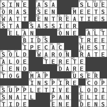 ACROSS 1. Trig term 5. White ___ sheet 8. Change direction abruptly 12. Mouths or openings 13. Elected rep. 14. Confronts 15. Electrical Unit 16. Pleas 19. R.R. building 20. More lively and spirited 21. Flair 23. Single 24. The first octave above the treble staff 27. Auction offers 30. Woody plant 31. Medicinal drug used to evoke vomiting 34. Command 35. Exchanged or delivered for money 38. Make _____ (do battle with) 40. Pace 41. _ vera 42. Cylindrical with tapered ends 44. Grant temporary use of 45. Have the gumption 46. Coat; cloak 47. Atlas unit 50. One who uses or employs something 53. Motivate 57. Police officer (slang) 59. Supplementary 63. Farming town in central California 64. Slow-paced one 65. Baking dish 66. Writer Wiesel 67. Event that recurs at intervals 68. Compass dir. 69. Cub Scout units DOWN 1. Sty mamas 2. Feeling or showing extreme anger 3. Relating to or accompanying birth 4. Eastern Standard Time (abbr.) 5. At sea 6. Elected reps. 7. Pismires 8. Put into a specified state 9. Flowery wreath 10. Shoshoni 11. Double-curved letter 14. Female horse 17. _ de Janeiro 18. Car or cant ending 20. Clip 22. Remained 24. Type of rug 25. For fear that 26. Wig 28. Morning condensation 29. Scram, to a cat 30. Threesomes 32. "We ___ not amused" (Victoria) 33. Drawstring 35. Table seasoning 36. Margarine 37. Having great length 39. Teachers' org. 43. Loyal 47. Place where flour is made 48. One (Scot) 49. Pacific Standard Time (abbr.) 51. Learning spot: Fr. 52. "The Thinker" sculptor 54. Corncob 55. _ the terrible 56. French philosopher Descartes 58. Sliced desserts 59. Fast jet (abbr.) 60. University (slang) 61. Groovy apt. 62. Sliced dessert 63. Directed