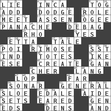 ACROSS 1. Falsehood 4. South American Indian 8. Coat; cloak 11. Say or write further 12. Evade 14. Hero or heavy, e.g. 15. Rendezvous 17. NE Netherlands city 18. Double curve, resembling the letter S 19. Flamboyance 21. Debunk (Brit. slang) 23. 17th letter of the Greek alphabet 24. Affirmative reply 25. Singer James 27. Falsehood 30. Luau course 31. Full of chinks, cracks, or crevices 34. Fast jet (abbr.) 37. Indiana (abbr.) 38. Lugs 39. D.D.E's nickname 40. Compass dir. 41. Make 43. Separate the seeds from cotton 44. "Mermaids" star 45. Long (Scottish) 47. Chop off 49. At a great distance 50. Underwater navigation system 52. Commissioned military rank 56. _ gin 57. Peak District village in England 60. Helper 61. Puts into a specified state 62. Having ears or earlike features 63. Commissioned mil. rank 64. Begley and Asner 65. Lairs 66. Also DOWN 1. Desk light 2. It may be bright or harebrained 3. Paradise 4. Potato state 5. Characteristic smell of wine 6. Music discs 7. Ripen 8. Ancient Roman robes 9. Cassini of fashion 10. Unit of force equal to gravity 13. Conclusion 14. Loose flowing garment 16. Small pie 20. Burn to charcoal 22. Sight organ 25. Immeasurably long periods of time 26. Periodic rise and fall of the sea level 27. Carrier 28. Toward the sea 29. For fear that 30. Sliced dessert 32. Hankering 33. Greater amount 34. Signal 35. Heroin 36. "___ Little Indians" 42. Enthusiasm 44. Accounting whiz (abbr.) 46. Length times width 47. Plunders 48. Singles 49. Gives food to 50. Downhill vehicle 51. To riddle 52. Small, secluded valley 53. Port city in Latvia 54. An important port of Yemen 55. Grant temporary use of 56. Compass dir. 58. June honoree 59. "We ___ not amused" (Victoria)