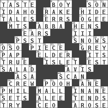 ACROSS 1. Clothes sense 6. Male child 9. Male offspring 12. Potato state 13. Immoral or dissolute person 14. Flintstone garb 15. Falsehoods 16. Blunders 17. Double curve, resembling the letter S 18. Mountains (abbr.) 19. Swedish rock group 20. Coop moms 21. Hearing organs 23. One more than two 24. Inconspicuous attention getter 25. Overwhelms 28. Bear (Spanish) 30. Component 34. Jennifer or Joel 35. Infant food 36. A person who is older than you are 38. It is 39. Loyal 41. Small island 43. Eastern Standard Time (abbr.) 44. Vegetable dish 46. Advice 48. White ___ sheet 49. Examine hastily 50. Group working together 51. "Silly old bear" 53. One (Scot) 56. Silvers or Donahue 57. Shopping center 58. Empty; void 60. Puts into a specified state 61. Toward shelter 62. Looks after 63. Attempt to accomplish something 64. Corporate head (abbr.) 65. Came up DOWN 1. Teat (slang) 2. First man 3. Table seasoning 4. College papers 5. Greek goddess of the dawn 6. Sharp remark 7. Gumbo ingredient 8. It is so 9. Seigniories (variant) 10. Lyric poems 11. Born 13. Confederate soldiers (slang) 14. Weeding 19. Nick name for Arthur 20. Part of HMS, perhaps 22. Viper 24. Teen's desire 26. Soaks 27. System (abbr.) 28. Chooses 29. "Two Mules for Sister ____" 31. Connecticut Ivy Leaguer 32. Music discs 33. Snakelike fish 37. Arrive at 40. Artist's stands 42. Federal power corp. 45. Obsolete 47. Sillier 49. Flatfish 50. "Mermaids" star 51. Light colored 52. Butter sub 54. Billionth: prefix 55. Extremities 56. Pacific Standard Time (abbr.) 57. Apple computer (short form) 58. Call ___ day 59. Compass dir.