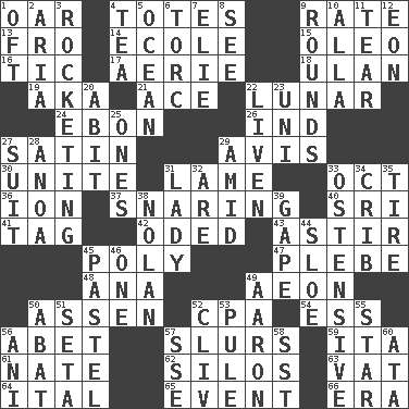 ACROSS 1. Rowing implement 4. Hauls 9. Pace 13. Away 14. Learning spot: Fr. 15. Butter sub 16. Nervous spasm 17. Nest on high 18. ____ Bator 19. Alias (abbr.) 21. Adept person 22. Type of eclipse 24. Inky black, to poets 26. Indiana (abbr.) 27. Smooth fabric 29. Advice 30. Join together 31. Unable to walk 33. Sep. follower 36. Electrically charged atom 37. Catching in a trap 40. Indian title of respect (Mr.) 41. Label 42. Wrote a lyric poem 43. Moving or stirring 45. Much (prefix) 47. Military trainee 48. Santa ___, CA 49. A really long time 50. NE Netherlands city 52. Accounting whiz (abbr.) 54. Curvy letter 56. Collude with 57. Runs notes together 59. Call ___ day 61. Nathan's nickname 62. Grain storage towers 63. Large container 64. Slanted text style (abbr.) 65. Happening 66. Epoch DOWN 1. Often (poetically) 2. Operatic vocal solo 3. Shooting up abruptly 4. Beverage made from leaves 5. Sea 6. Torque (variant) 7. Writer Wiesel 8. Observe 9. Periods in a boxing match 10. Silent film actress Nazimova 11. Pull into pieces 12. A really long time 20. "This won't hurt ____!" 22. Make or become more lively 23. Single; one (prefix) 25. Singles 27. Set or collection 28. Small Philippine buffalo 29. Among 31. Kenny Rogers chart-topper in '80 32. "We ___ not amused" (Victoria) 33. Clearly or manifestly demonstrative 34. Baby bed with high sides 35. Become fatigued 38. Pitcher Ryan 39. Yawn 44. _ gin 45. Soft color 46. Single 49. Composer Copland 50. Blind as ____ 51. Bristle 52. 154 in Roman numerals 53. Whine 55. Play the lead 56. Black tropical American cuckoo 57. Compass dir. 58. Fast jet (abbr.) 60. "One Day ___ Time"