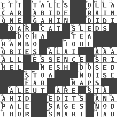 ACROSS 1. Lizard (obsolete) 4. Falsehoods 9. Rounded earthenware pot or jar 13. Auto 14. Remain 15. Water falling in drops from the sky 16. Single 17. Street urchin 18. "You Light Up My Life" star Conn 19. Boat paddle 21. Domesticated feline 22. Bobsleighs 24. Capital of the state of Qatar 26. Beverage made from leaves 27. Role for Stallone 29. Implement 30. Off-Broadway awards 31. Jai ____ 33. American Automobile Association (abbr.) 36. Everything 37. Center 40. _ Lanka 41. Cartoonist voice _ Blanc 42. Tender 43. Administered medicine 45. Portico 47. Annoying sound 48. Ewer handle 49. Atlas contents 50. Native American of Southwest Alaska 52. "We ___ not amused" (Victoria) 54. R.R. building 56. Among 57. Proofreads 59. Santa ___, CA 61. Light colored 62. Gurus 63. Lower and raise head in agreement 64. Son of Odin 65. Don Adams' spy role 66. Small amount or degree DOWN 1. Environmental prefix 2. Papal veil 3. Excercise machine 4. Label 5. Phillipine bananalike plant 6. Pale green bean 7. Prepare for publication 8. Elected rep. 9. Severe or trying experience 10. Put down 11. Hats (slang) 12. Cuckoo 20. Loose flowing garment 22. Unemotional 23. Lion 25. Stockings 27. Wander 28. Competent 29. Hyperbolic tangent 31. Toward the sea 32. French article 33. Helper 34. Ancient Greek god of war 35. Assistant 38. Derisive sound 39. Pulitzer Prize-winning author Ferber 44. I made a mistake 45. Sowing specialist 46. The 19th letter of the Greek alphabet 49. Distance measurement 50. Housemaid 51. _ and Stitch 52. First of billions? 53. Port city in Latvia 55. Small Philippine buffalo 56. Fitting 57. Curvy letter 58. Fast jet (abbr.) 60. Find the sum of